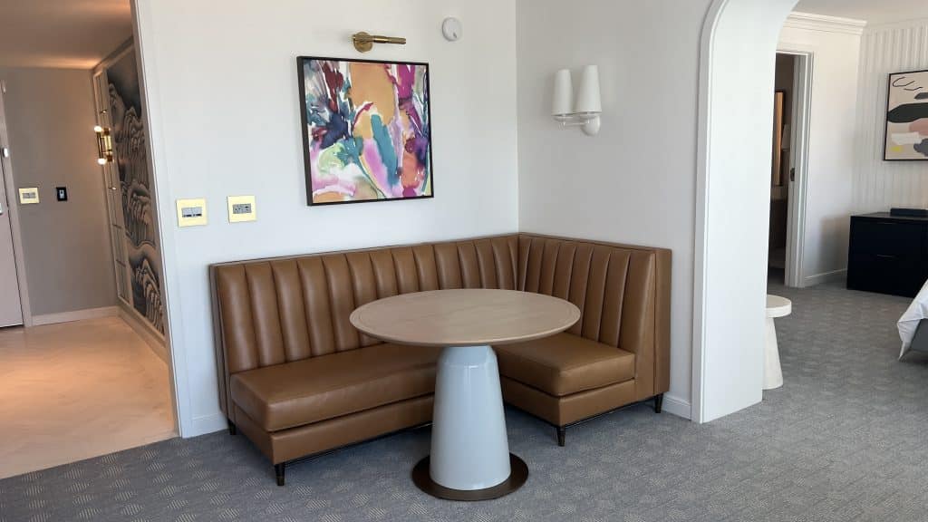 Nach dem Betreten des Zimmers auf der linken Seite findet man etwa einen Ess- oder Arbeitsbereich, die aus einer gepolsterten Lederbank sowie einem dazugehörigen Tisch besteht.