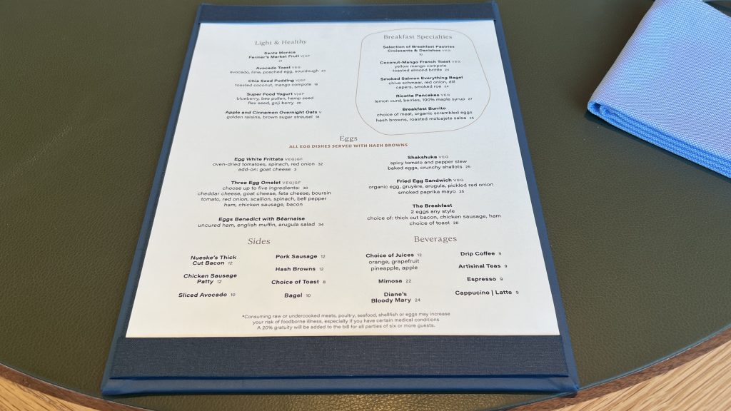Wie in den USA üblich, wird das Frühstück im Regent Santa Monica à la carte serviert. Hauptgerichte liegen dabei zwischen 20 und 35 US-Dollar vor Steuern und Trinkgeld, dafür gibt es eine recht attraktive Auswahl, von gesunden Optionen wie Avocado Toast bis hin zu Eggs Benedict.