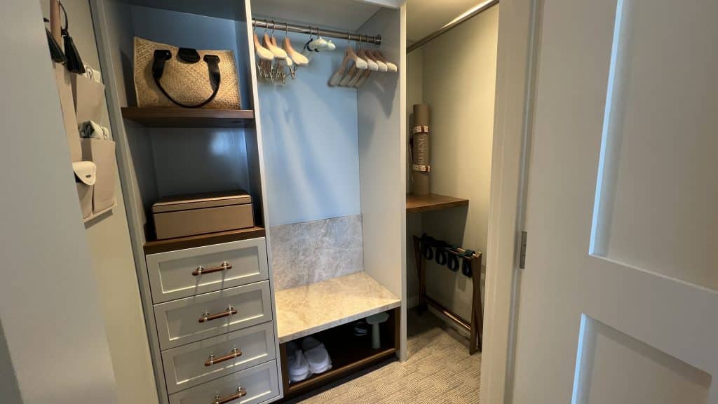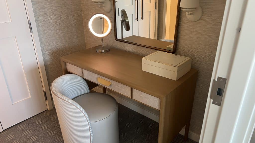 Dass ich bei meinem Regent Santa Monica Test oft das Gefühl hatte, eher in einer Suite denn in einem Zimmer zu sein, liegt auch an der Aufteilung des Zimmers. Geht man vom Schlafzimmer nämlich in Richtung Bad, kommt man in einen richtigen Ankleidebereich, der unter anderem einen Schminkspiegel mit Sitzgelegenheit aufweist.