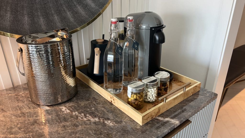 Ebenfalls findet man hier die Minibar, wobei die „neue“ Regent-Marke dadurch auffällt, dass alle Softdrinks und Snacks generell kostenfrei sind – außerdem wird die Minibar jeden Tag kostenfrei aufgefüllt.