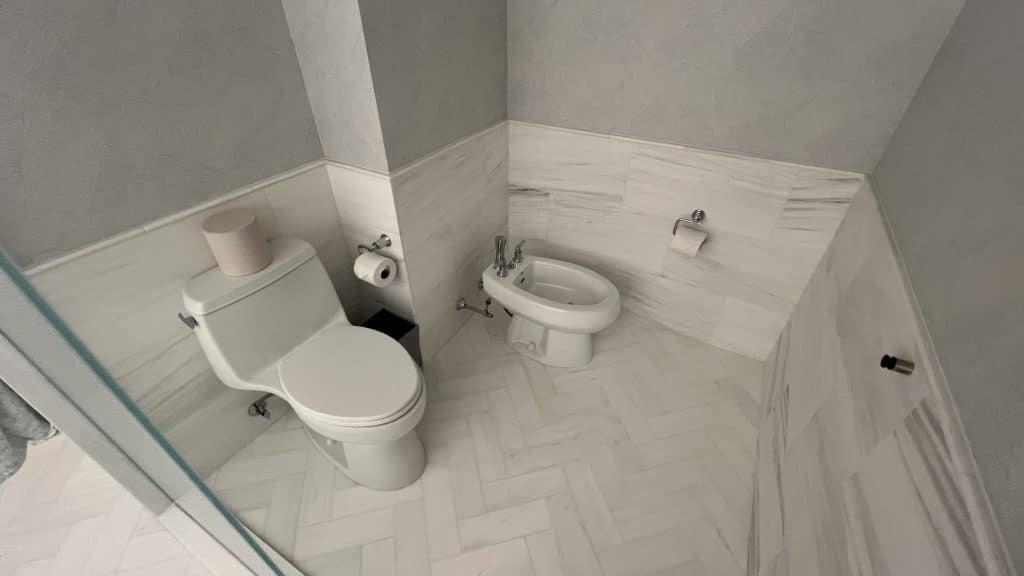Im vorderen Bereich des Bades, abgetrennt durch eine Milchglastüre, findet man natürlich auch noch eine Toilette und ein Bidet.