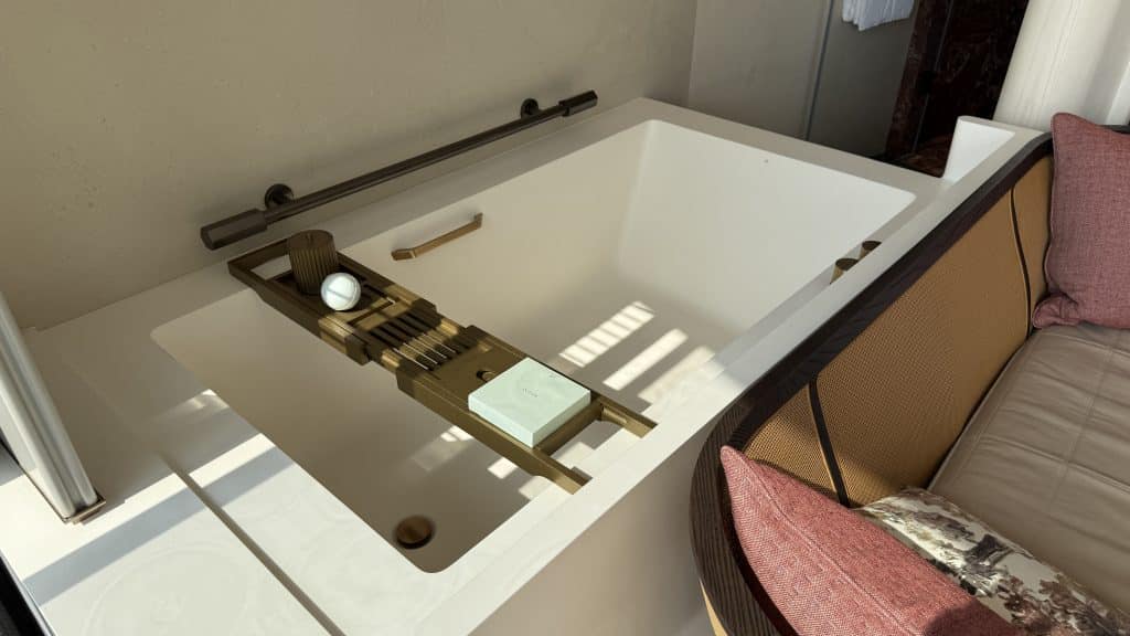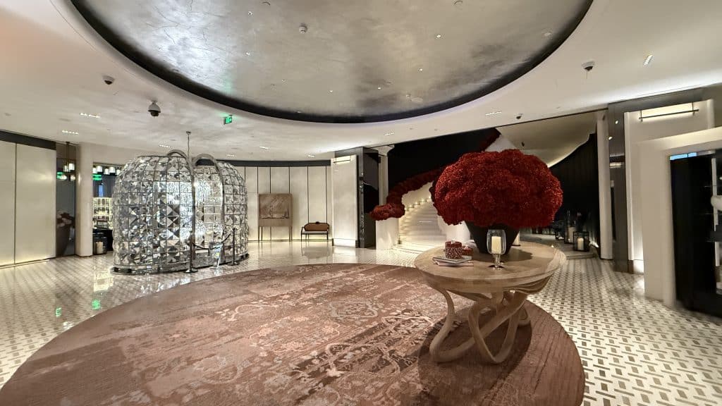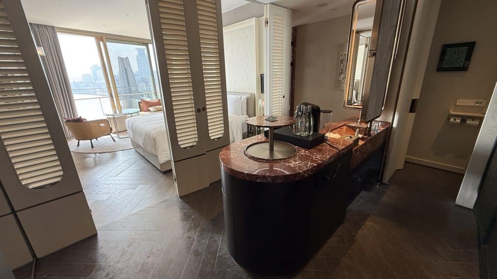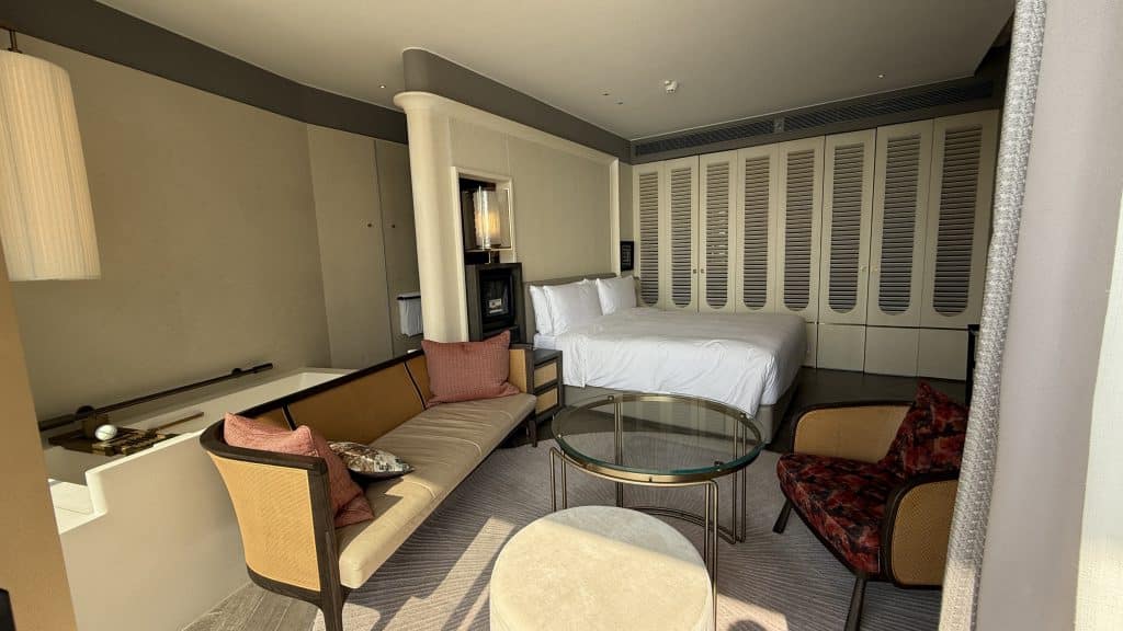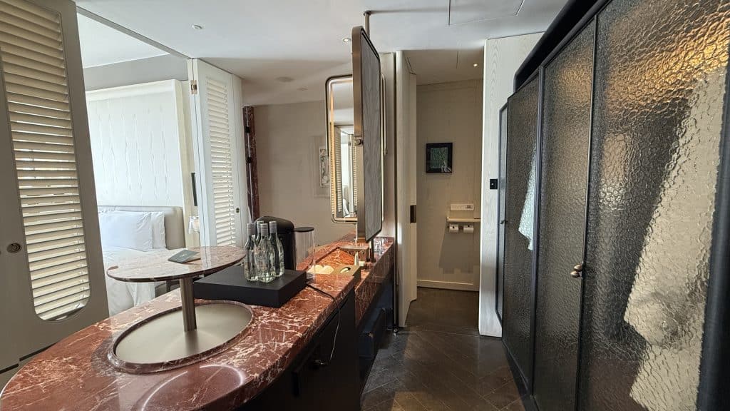 Das liegt primär daran, dass der Eingangsbereich im Grunde genommen direkt mit dem offenen Badezimmer verschmilzt. Für ein Luxushotel auf höchstem Niveau ein eher ungewöhnliches Konzept.
