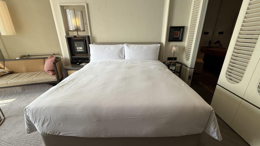 Der Schlafbereich als solcher ist dann gar nicht allzu groß und besteht im Grunde genommen primär aus einem King Bett, das durch seine enorme Bequemlichkeit sowie hochwertige Bettwaren und gute Kissen zu überzeugen weiß.