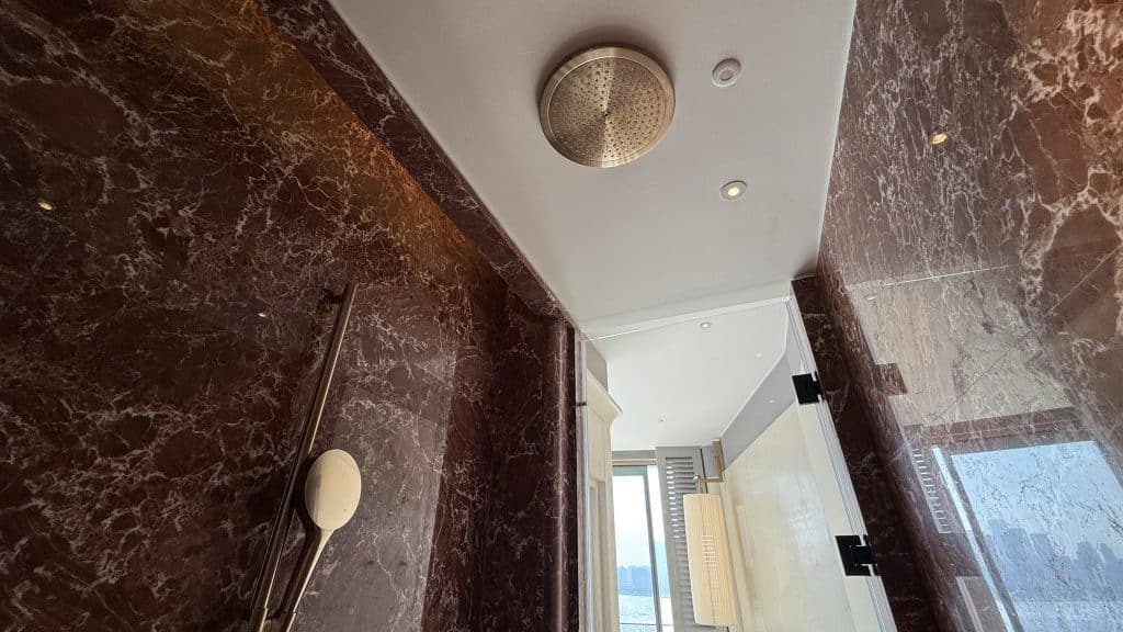 Hier findet man einen Regenduschkopf genauso wie einen regulären Duschkopf. Der Wasserdruck und auch die Temperatursteuerung wissen dabei zu überzeugen.