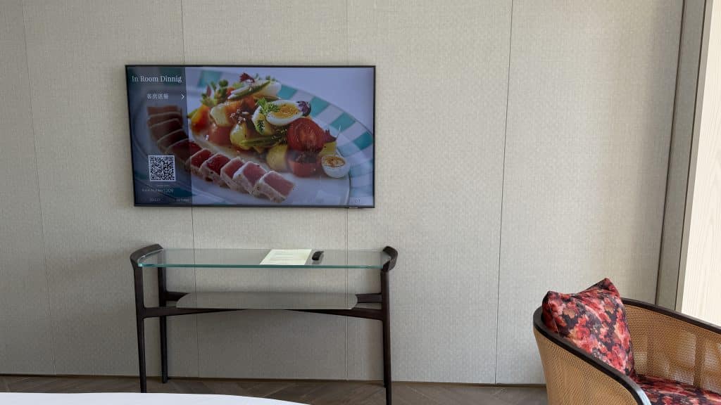 Auf der gegenüberliegenden Seite hängt leicht quer versetzt ein Flachbildfernseher, der auch die üblichen Smart-Funktionen bietet und unter anderem auch der Ort ist, an dem das Room Service Menü zu finden ist.