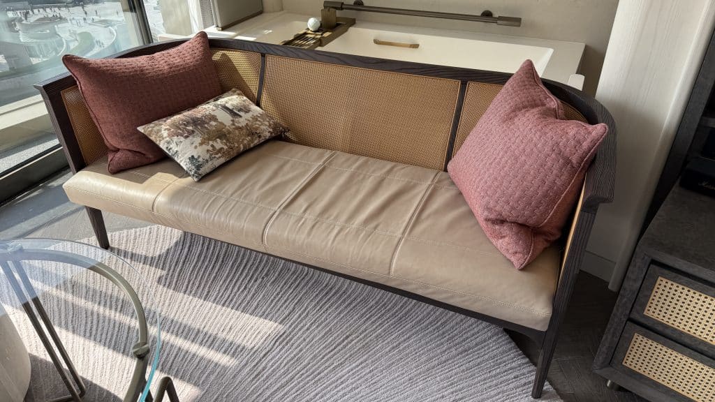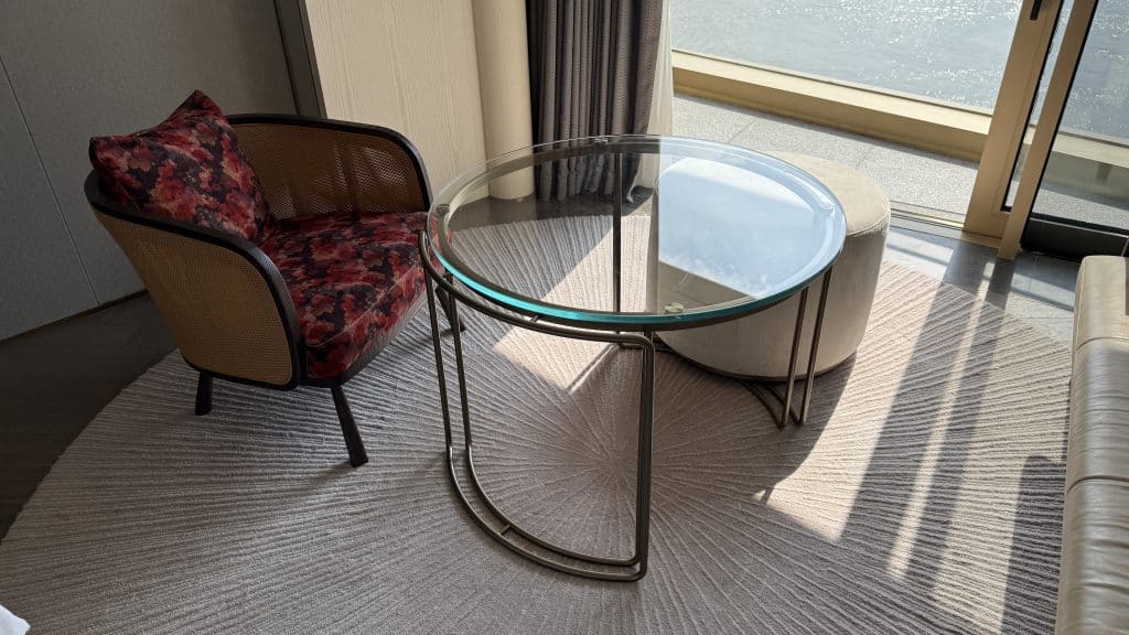 Hier findet man im Grunde genommen nur einen Sessel, einen mittelgroßen Tisch sowie ein Sofa. Auf letzterem kann man sich entspannt niederlassen und den tollen Ausblick genießen.