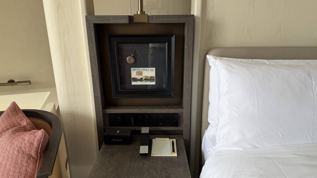 Auf beiden Seiten des Bettes findet man zudem einen stilvollen Nachttisch sowie entsprechende Beleuchtung. Hier gibt es jeweils auch alle notwendigen Lichtschalter sowie internationale Steckdosen, sodass man auch seine Elektrogeräte problemlos laden kann.
