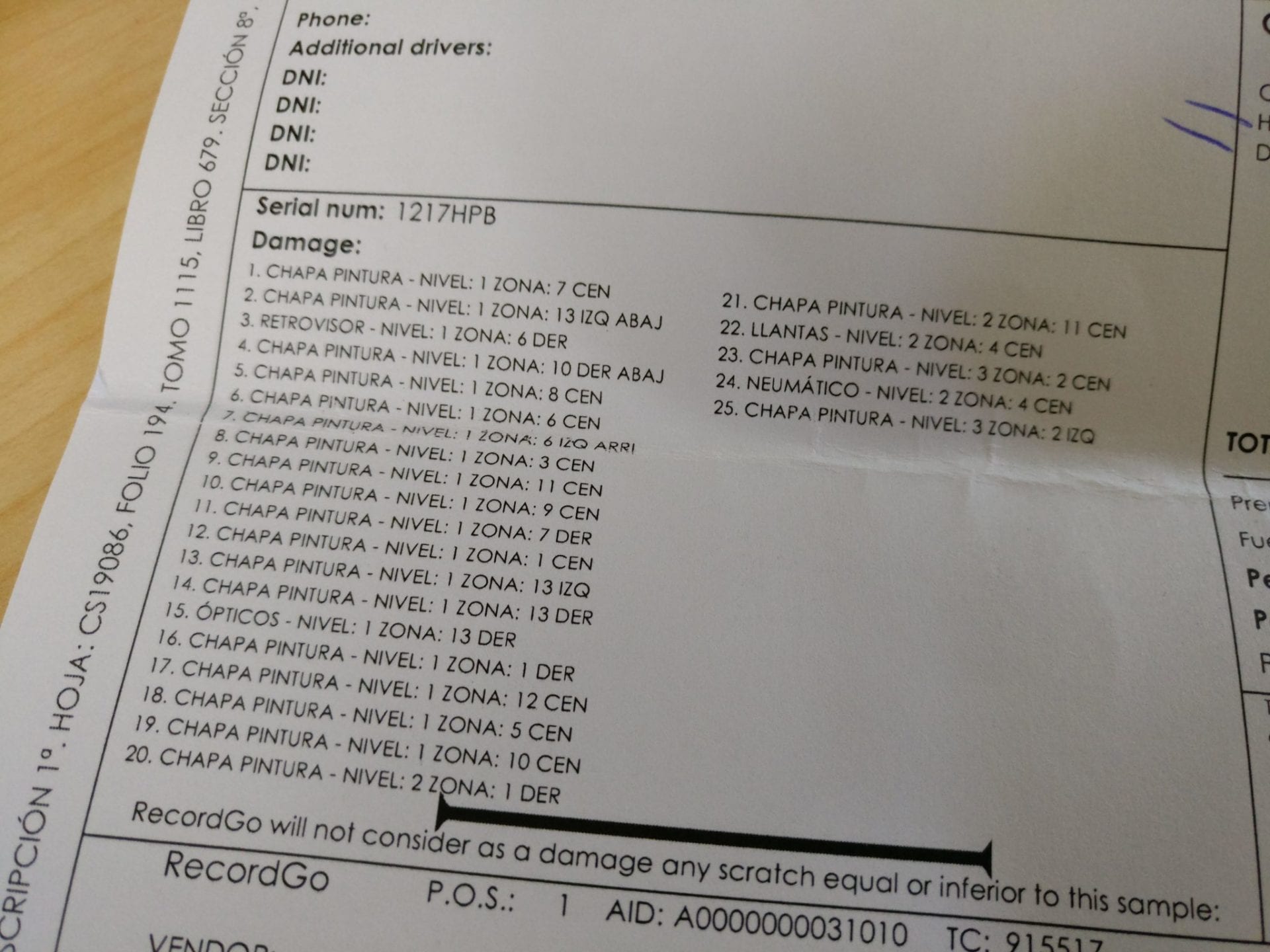 Wenn man das Auto mal gefunden hat (man muss es selbst suchen, da keiner weiß, wo es steht), kann man sich einen ersten Eindruck machen. Zwar hatte das Auto etwa zwanzig Schäden, diese waren aber nicht so gravierend wie erwartet. Immerhin waren auch alle Schäden (denke ich zumindest) auf dem Vertrag vermerkt.