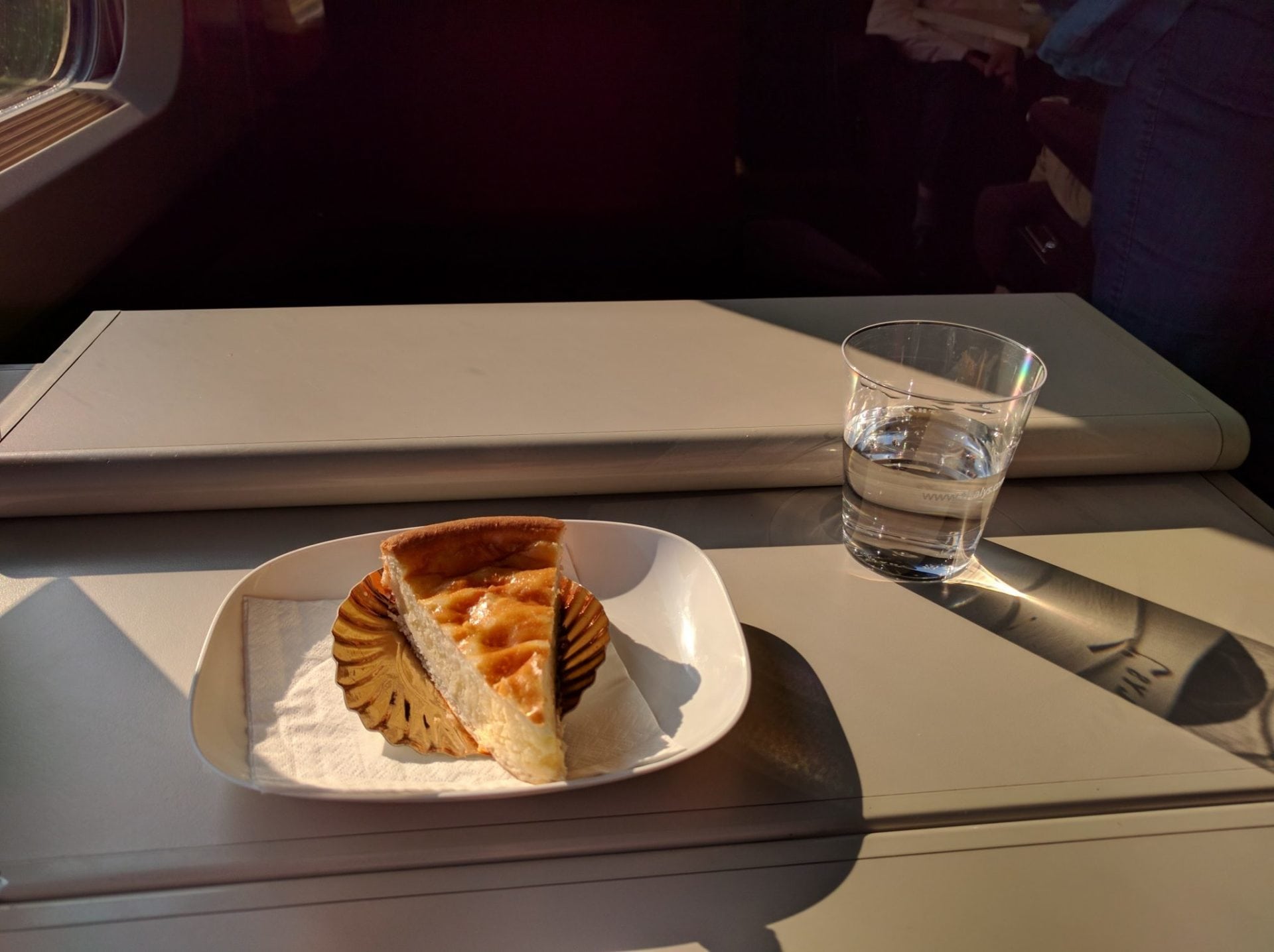 In der ersten Klasse ist im Fahrpreis ein Getränk und eine Kleinigkeit zu Essen inklusive. Die Auswahl variiert je nach Fahrstrecke und Uhrzeit. Zur Mittagszeit und gegen Abend gibt es wohl eine vollwertige Mahlzeit. Bei meiner Fahrt am späten Nachmittag gab es nur ein kleines Stück Käsekuchen, alternativ hätte ich auch ein Sandwich oder Schokoladenmousse haben können. Dazu wurde ich mehrmals nach Getränkewünschen gefragt, auch Wein wird kostenfrei angeboten. Kurz vor meinem Ziel erhielt ich zum Abschied noch salzige Cracker. Bei einer Fahrtzeit von circa zwei Stunden und 15 Minuten gibt es hier mehr Catering als an Bord der allermeisten Airlines. Trotzdem hatte ich auf ein vollwertiges Menü gehofft.