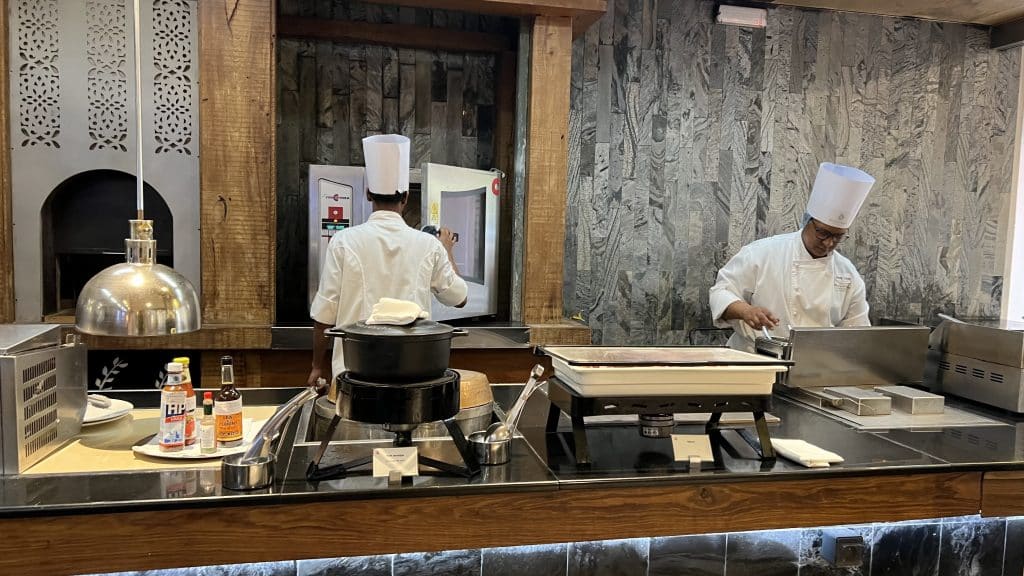 Eine Live-Cooking-Station sorgt im L’Oasis des Trou Aux Biches Beachcomber Hotel Mauritius dafür, dass Gäste sich ihre eigenen Eierspeisen zusammenstellen können.