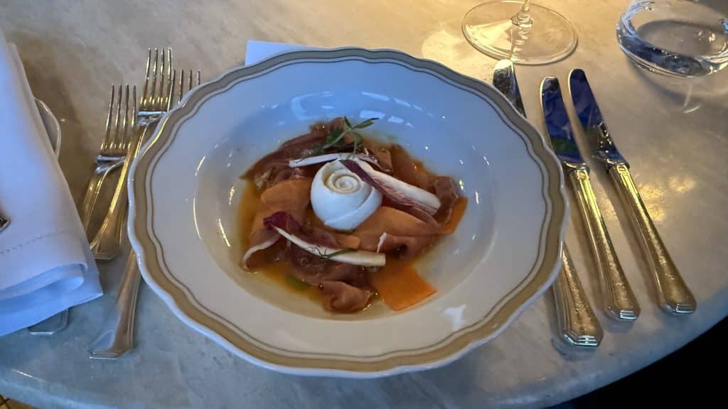 Aus Zeitgründen konnte ich bei meinem ersten Rosewood Schloss Fuschl Aufenthalt nur das Abendessen testen, allerdings sind die Karten beim Mittagessen ähnlich. Am ersten Abend ging es ins Schloss Restaurant, das einen Gourmet-Anspruch hat und neben einem Tasting-Menü auch à la carte Speisen anbietet.