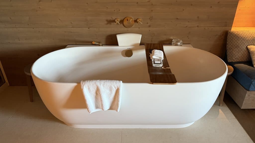 Halboffen zum Schlafzimmer hin befindet sich auch das Badezimmer der Chalets, das im ersten Moment durch die freistehende Badewanne auffällt, bei der es auch an keinen Utensilien fehlt.