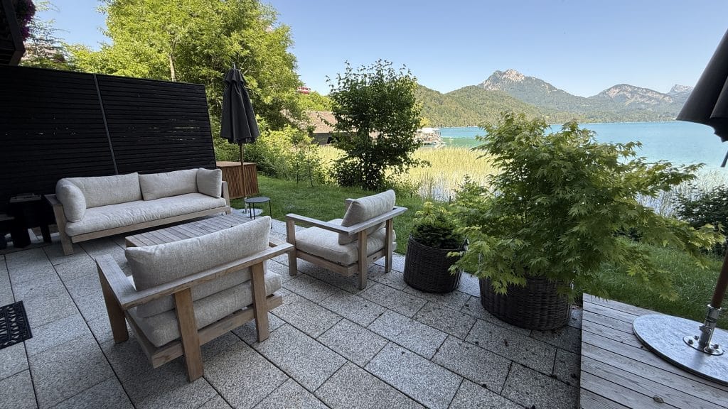 Das liegt auch daran, dass an den Wohnbereich direkt die Terrasse anschließt, die eine ziemliche Seltenheit ist. Ein Nachteil im Rosewood Schloss Fuschl ist nämlich, dass durch die alte Bausubstanz nur wenige Zimmer über Balkone und Terrassen verfügen.