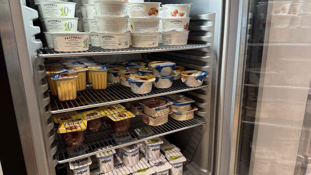 In Hinblick auf die Verpflegung findet man am späten Vormittag diverse verschiedene Joghurts, Obst und einiges mehr in einem Kühlschrank.