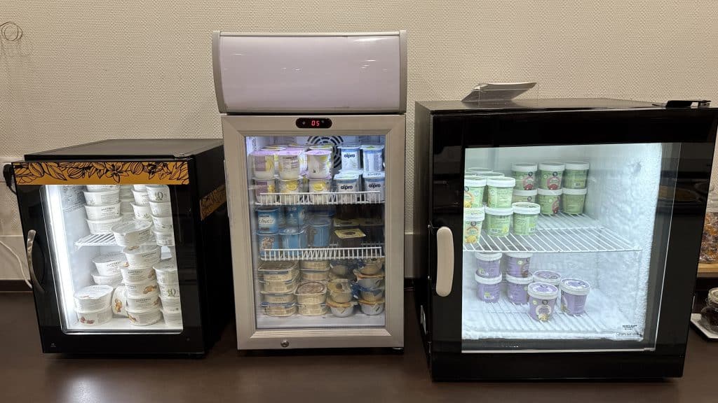 In Kühlschränken findet man immerhin auch noch ein wenig Obst und Joghurt. Auch Eis gibt es in der Lounge.