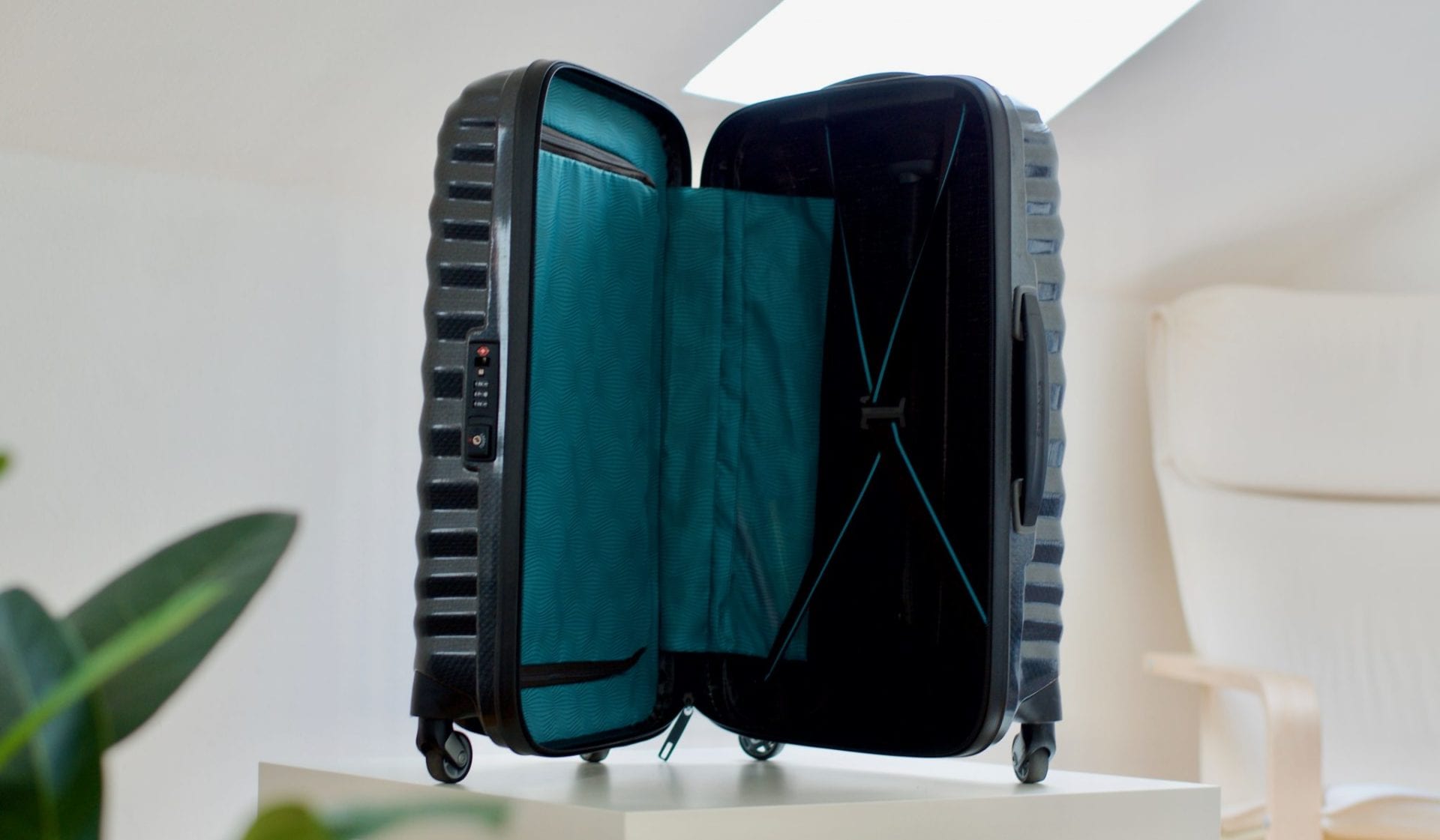 Bei der Suche nach einem neuen, stabilen Koffer für das Handgepäck schwankte ich lange zwischen Rimowa und Samsonite. Da der Samsonite mit 1,7 Kilogramm mehr als ein Kilogramm leichter war als sein Gegenstück von Rimowa, entschied ich mich schließlich für einen Koffer von Samsonite. Dieser kostet bei Samsonite in der 55cm Ausführung etwa 329 Euro. Der Koffer ist aus Polycarbonat beziehungsweise Curv gefertigt und bietet 36 Liter Volumen. Dazu kommen noch zehn Jahre Garantie.