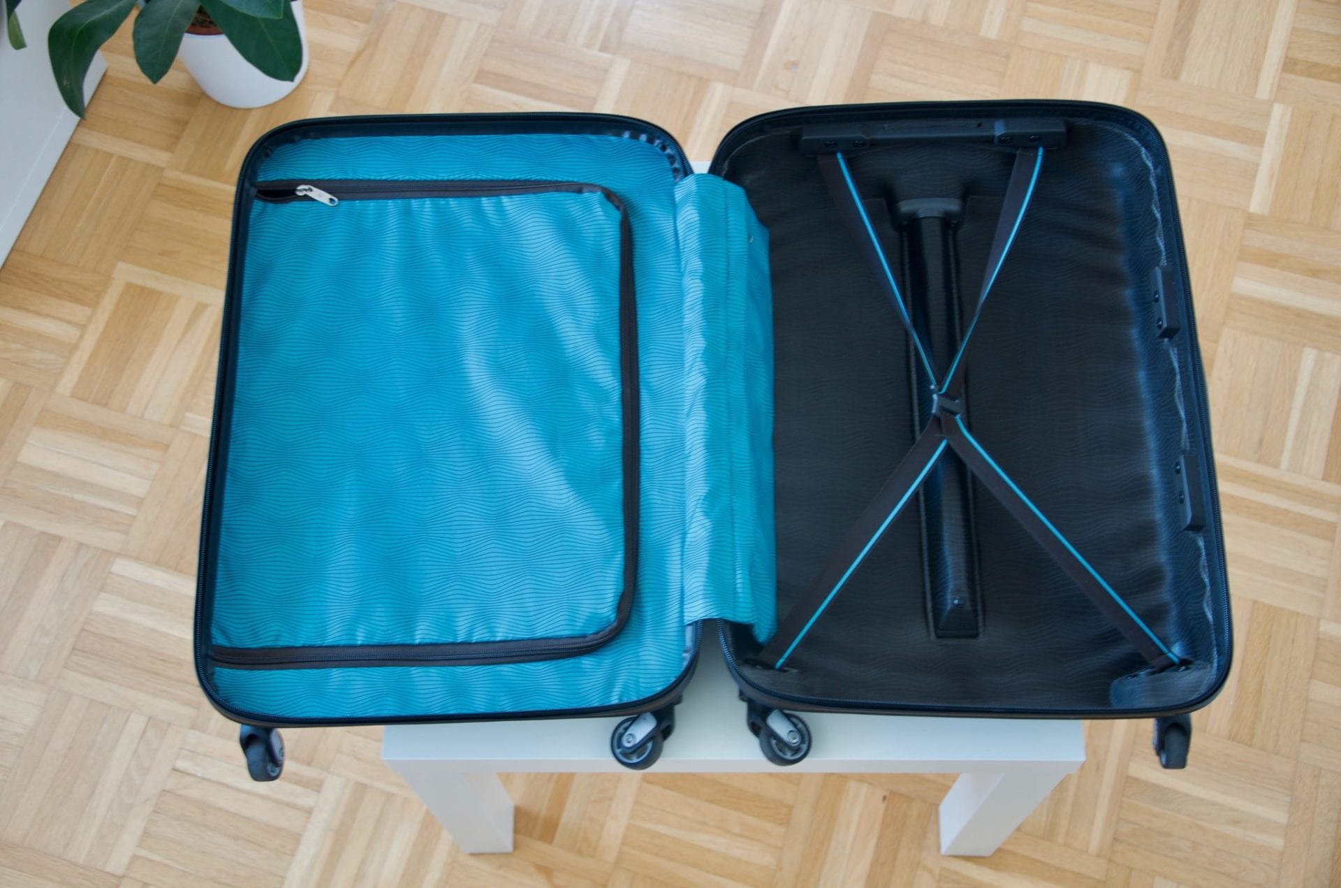 Die rechte Schale des Koffers lässt sich durch einen Stoffdeckel, der durch einen Reisverschluss gesichert ist, einfach schließen. Dieser Deckel hält sehr gut und stabil seinen Inhalt in der Schale des Koffers. Einlegeböden oder weitere Taschen sind leider nicht vorhanden. Dadurch muss man entweder eigene anschaffen oder entsprechend packen. Dies ist ein kleiner Nachteil, führte für mich aber in der Praxis bisher noch zu keinen Problemen.