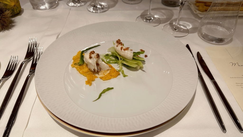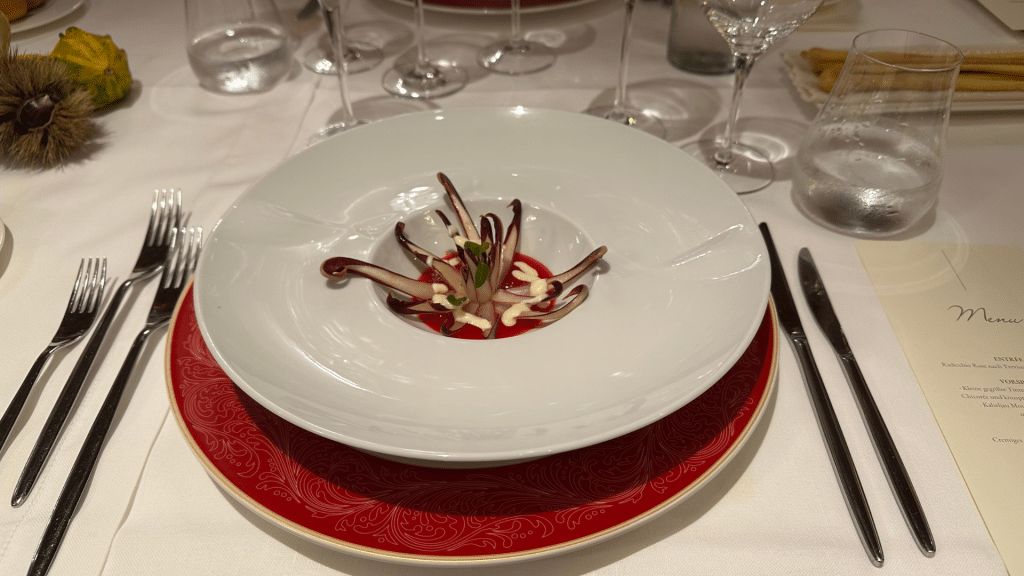 Am ersten Abend wurde für unsere Gruppe ein mehrgängiges Menü im Duca d’Aosta zusammengestellt. Zur Vorspeise gab es neben einem Radicchio-Salat, gegrillte Tintenfische auf einer Kabeljau-Mousse. Im Zwischengang gab es ein sehr leckeres Risotto mit Hummer und als Nächstes eine Fisch-Consomme.