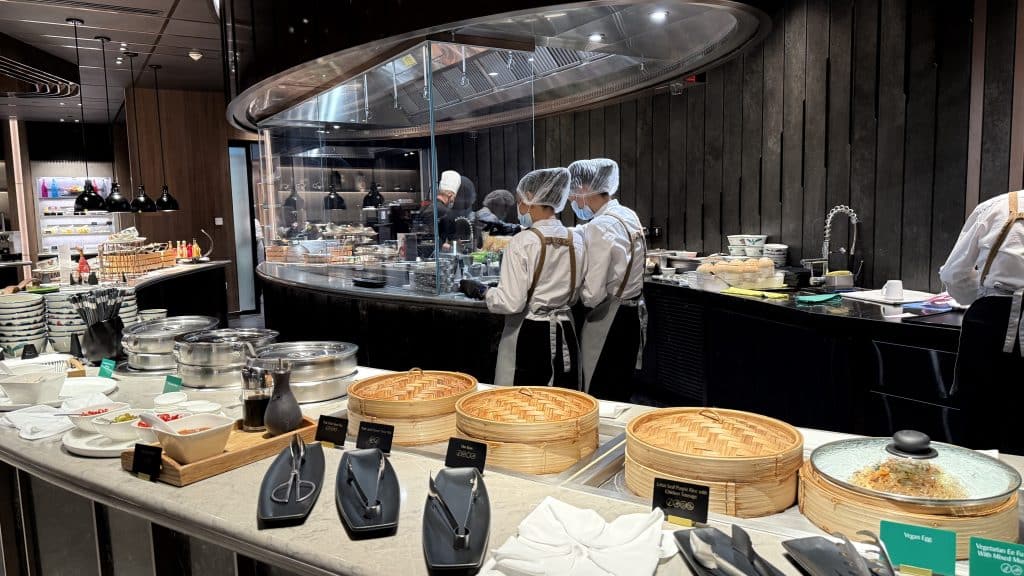 Daneben darf man sich auch auf eine Live-Cooking-Station freuen, an der man diverse warme Gerichte bestellen kann – darunter westliche Klassiker genauso wie asiatische Hauptgerichte.