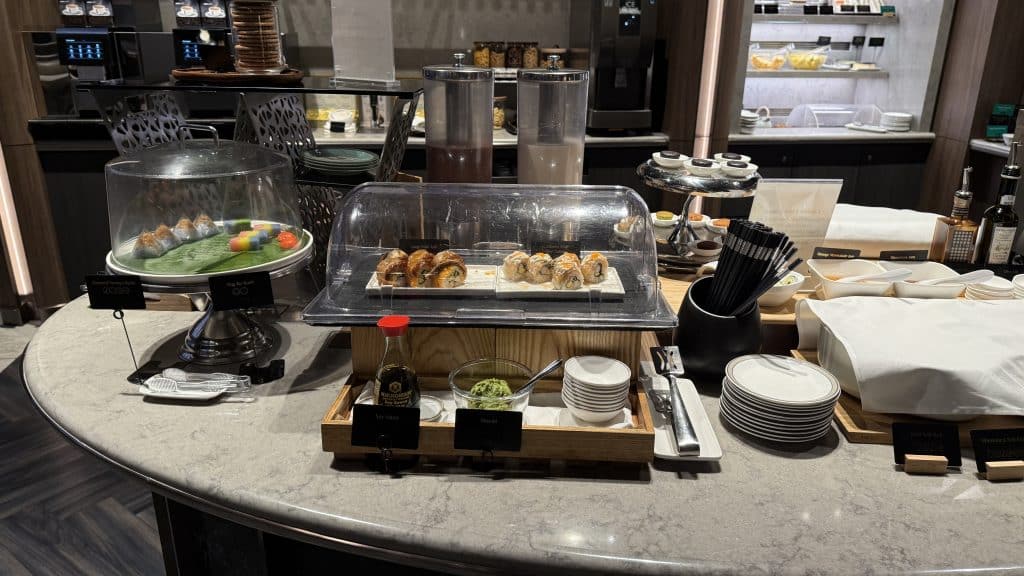 Diese werden dann frisch zubereitet, sodass man eine höhere Qualität erwarten kann als in den meisten anderen Lounges. Ansonsten gibt es natürlich auch noch ein Salatbuffet, ein paar weitere Vorspeisen sowie diverse Desserts.