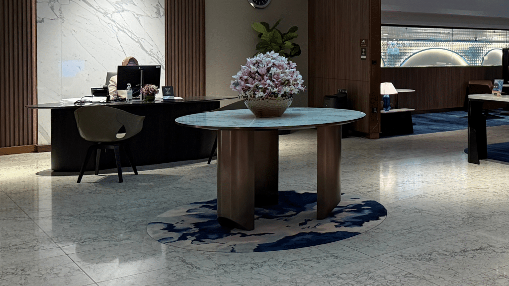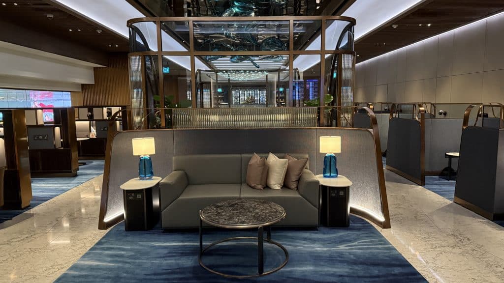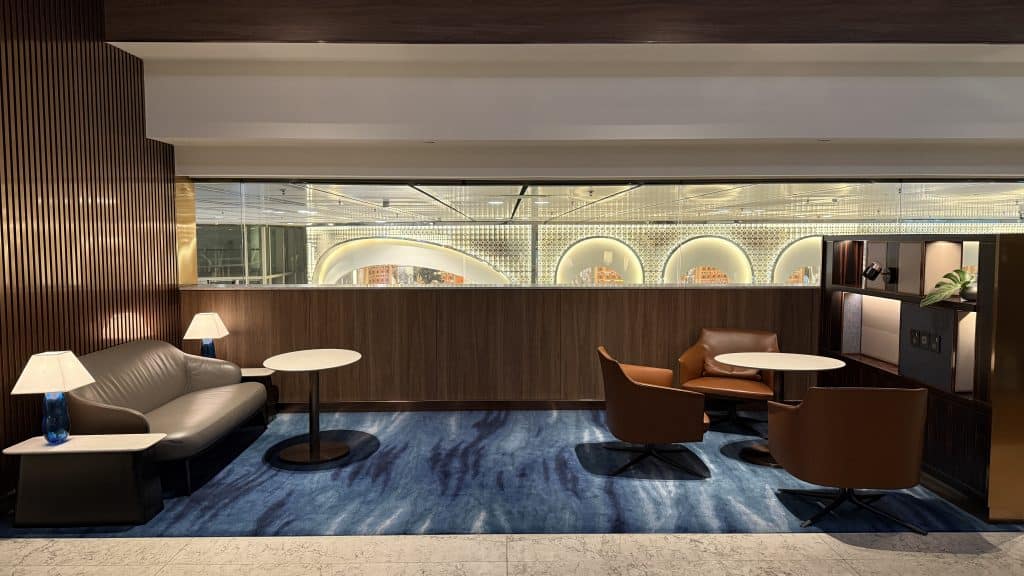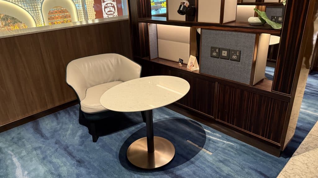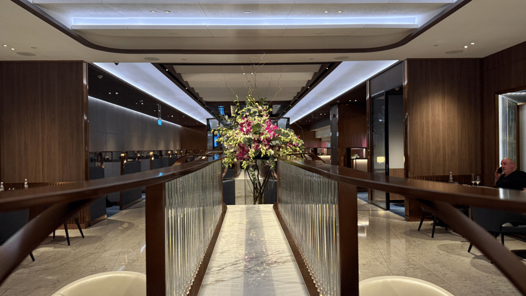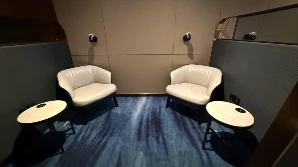 Allzu groß ist der Private Room mit knapp 1.000 Quadratmetern und etwa 80 Sitzplätzen nicht. Dafür ist die Einrichtung allerdings ausgesprochen stilvoll, was einem schon im Eingangsbereich auffällt. Hier befindet sich auch ein Service-Desk, den man etwa bei Flugunregelmäßigkeiten aufsuchen kann.