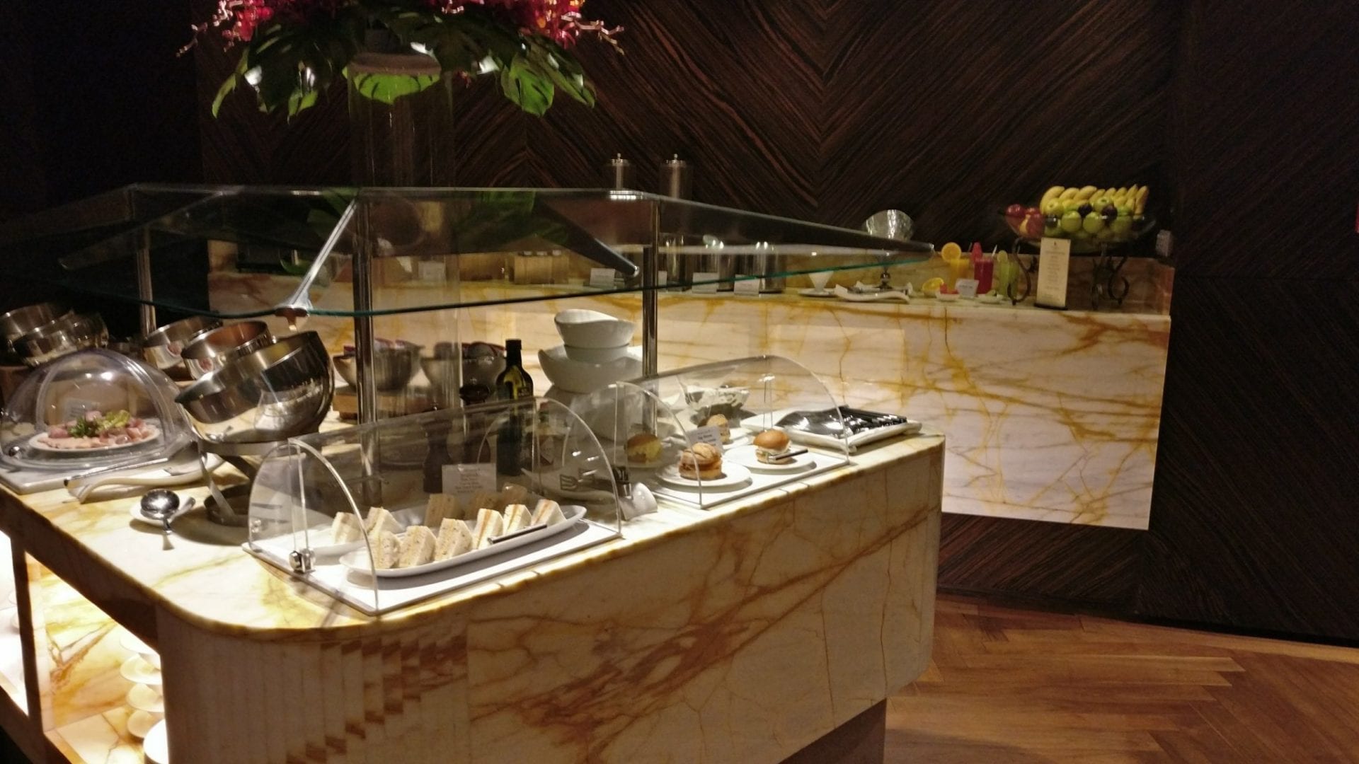 Insgesamt weiß die Lounge durch hohe Decken und gedeckte Farben zu überzeugen. Die Marmorverkleidung sowie das Leder- und Plüschmöbiliar sorgen für ein hochwertiges Ambiente.