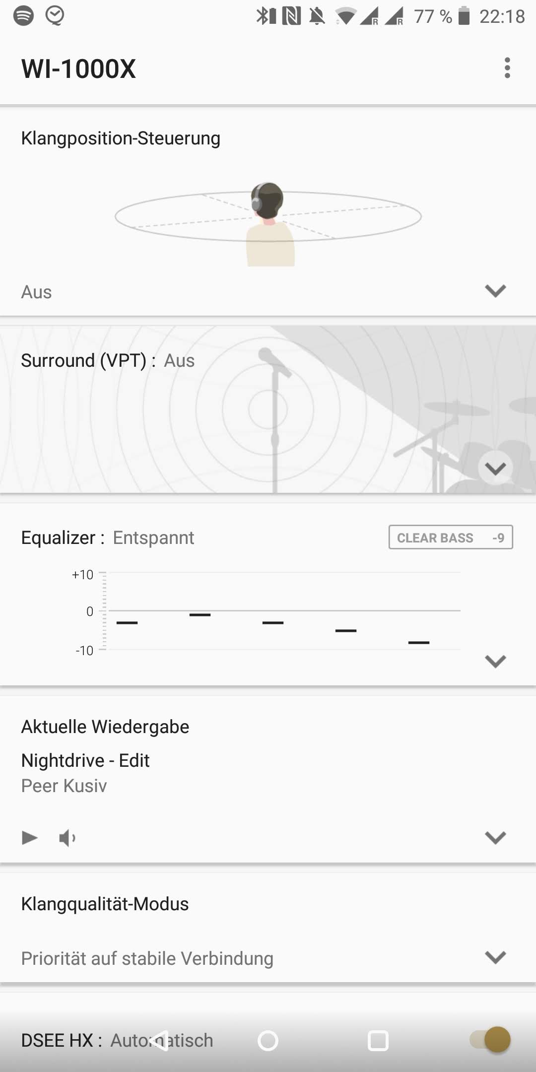 Zudem sei noch die Sony Headphones App für Android und iOS erwähnt. In dieser könnt Ihr Noise Cancelling Einstellungen anpassen, mit verschiedenen Klangpositionen und Surround-Sound spielen und zudem den Equalizer nutzen.