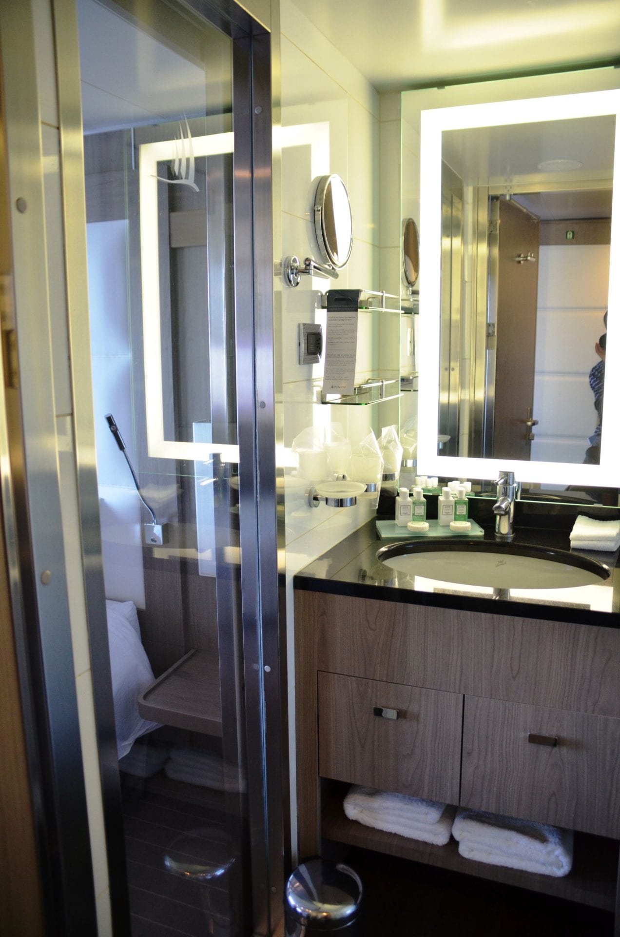 Zu zweit hat man ausreichend Platz und viel Stauraum für das Gepäck. Die Koffer kann man praktisch unter dem Bett verstauen. Zur Ausstattung gehören ein Safe, eine immer aufgefüllte Minibar, ein Fernseher (auch viele deutsche Filme), eine Nespresso-Maschine, zwei Bademäntel und -schlappen, Steckdosen für US- und EU-Stecker, 24 Stunden Room Service und natürlich hochwertige Pflegeprodukte von Hermes. Alles auf den Punkt durchdacht und extrem hochwertig. Zudem sind diese sehr geräuscharm und man hört nichts vom Nachbarn. Die Zimmer werden zweimal täglich gereinigt und am Abend zudem das Bett bereitet. Auch die Bäder sind für ein Schiff luxuriös.