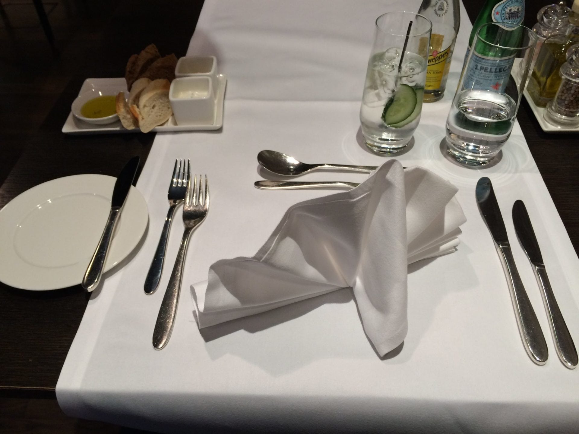 Daneben stehen auf beiden Seiten mehrere eingedeckte Tische, die klassisches Restaurant-Feeling aufkommen lassen und die sich ideal zum Speisen eignen. Gerade hier wurde es bei meinem Besuch zur Mittagszeit so voll, dass es keinen Platz mehr gab – in einer First Class Lounge doch eine negative Überraschung.