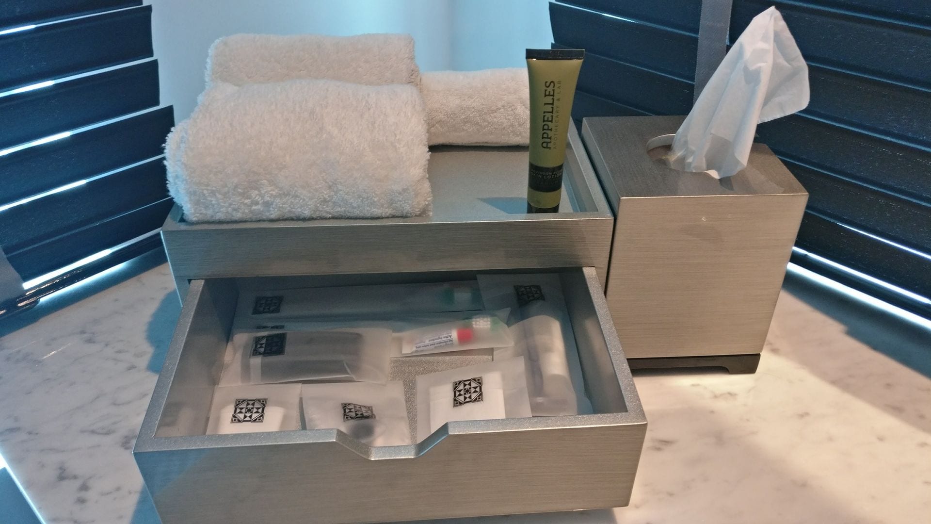 Das Bad ist in manchen Zimmern lediglich mit einem dicken Vorhang vom Hauptzimmer getrennt und ist mit modernen Regenduschen ausgestattet. In manchen Zimmern ist hier zusätzlich noch der Kleiderschrank platziert. Schön finde ich die große Auswahl an Toiletries, die in einer kleinen Schublade platziert sind. Wer zu lange duscht, läuft hier allerdings Gefahr, das Bad zu überschwemmen.