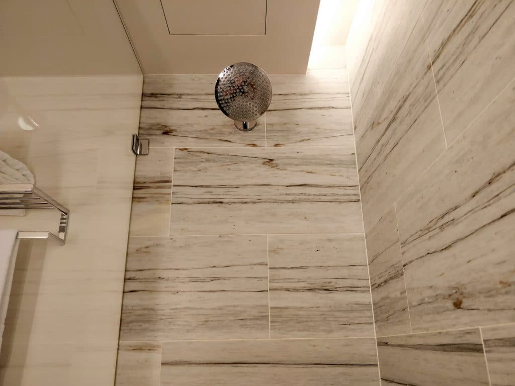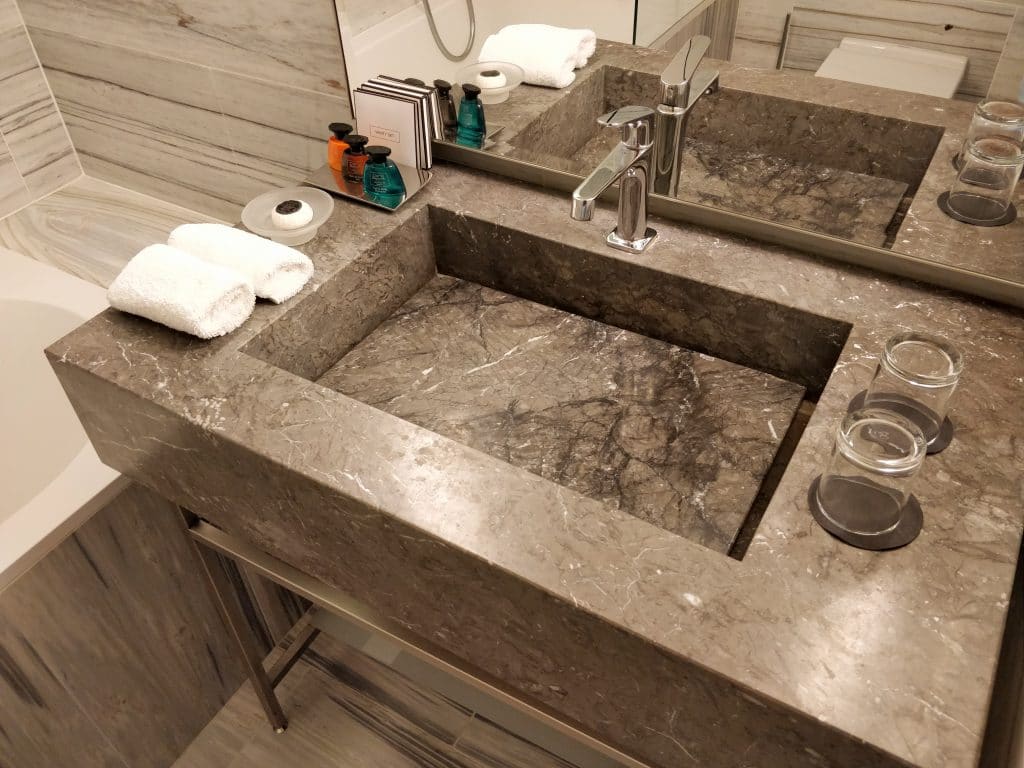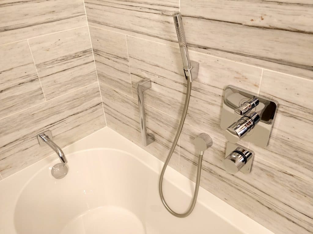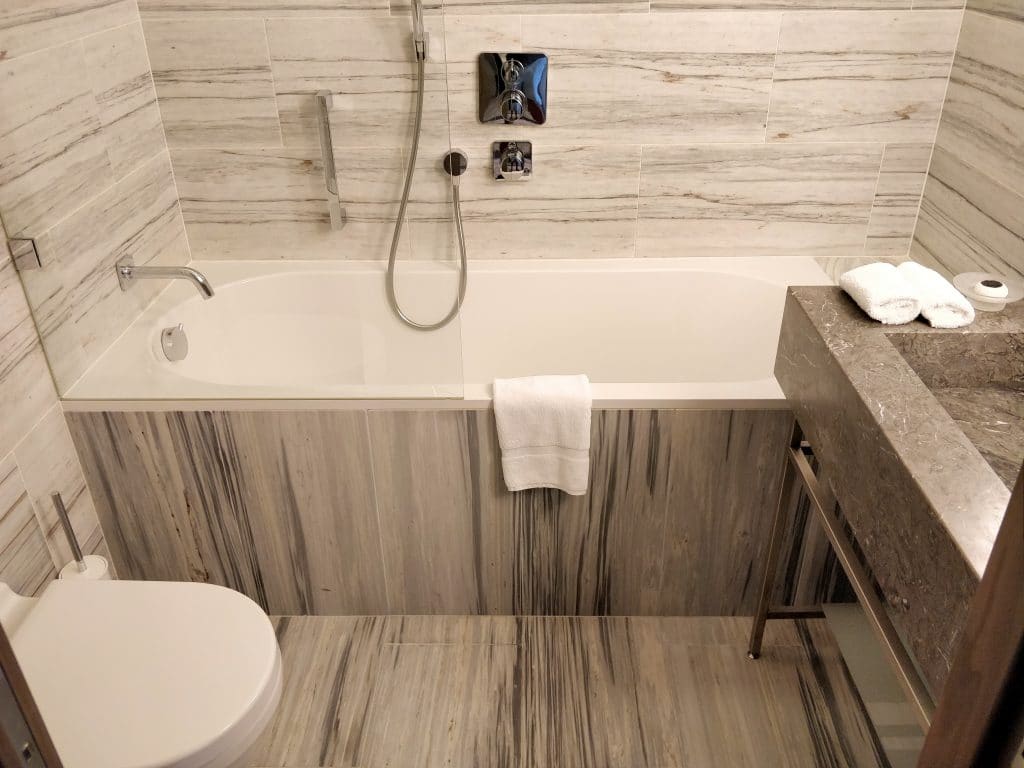 Das Badezimmer ist in den Räumen des Emblem Prag ebenfalls nicht relevant größer, dafür aber sehr modern und schick – wie generell der Stil der Zimmer. Es gibt hier eine Kombination aus Badewanne und Dusche, die in hochwertigem Marmor-Design daherkommt.