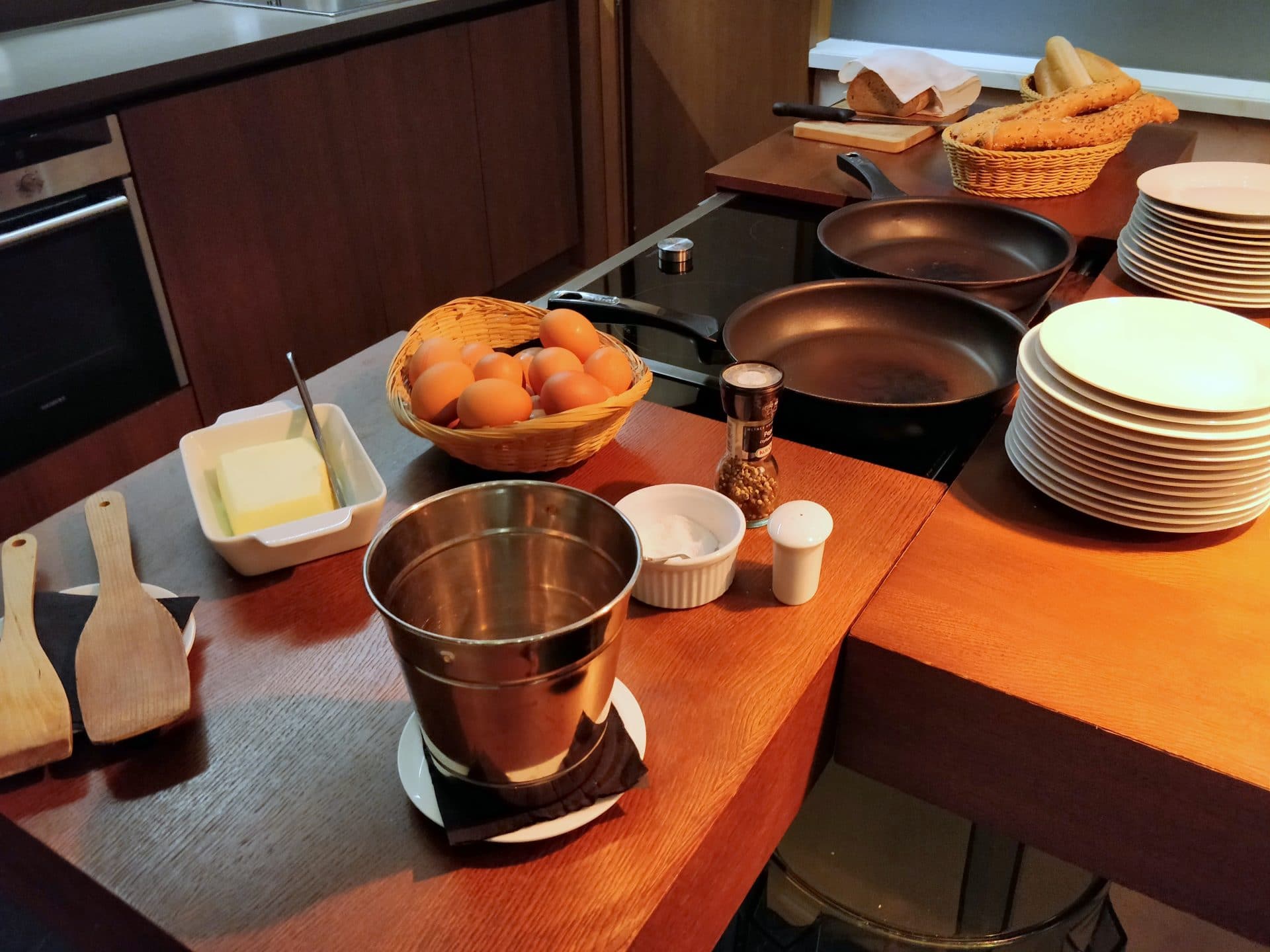 Fasziniert habe ich auch die Eier und Pfannen beobachtet – ob man sich hier Eier selbst hätte zubereiten sollen oder ob das eigentlich ein angebotener Service ist, hat sich mir nicht erschlossen.