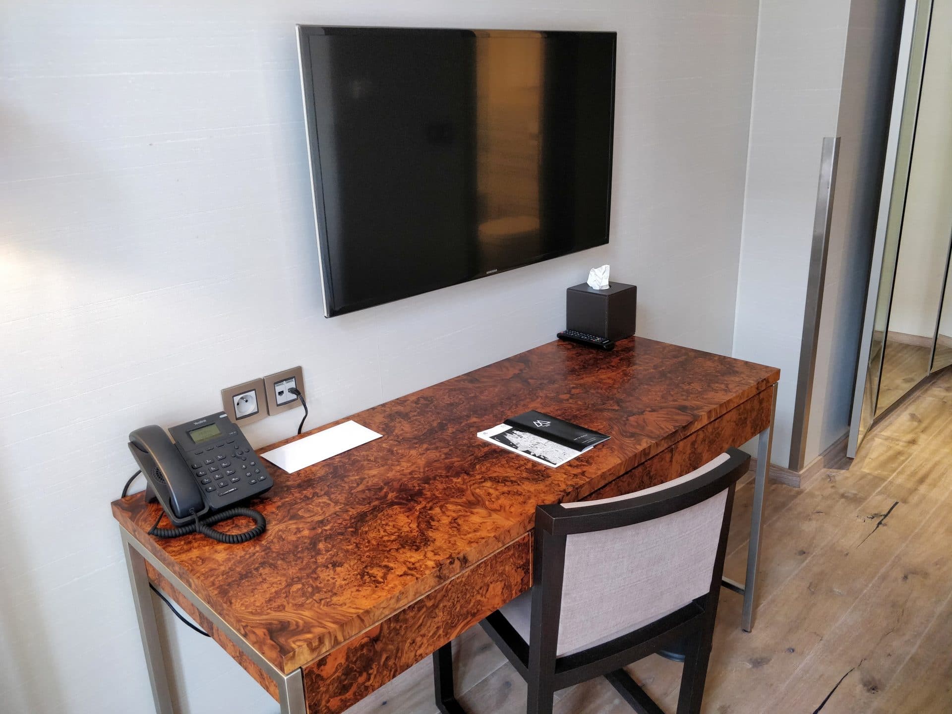 Gegenüber gibt es noch einen Fernseher sowie einen kleinen Schreibtisch mit einem Stuhl – hier lässt sich ganz ordentlich arbeiten, sodass der Platz effizient genutzt ist.