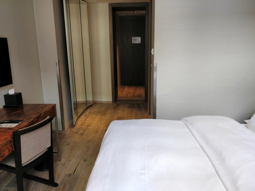 Nach dem Eingangsbereich folgt links das Bad, geradeaus das Zimmer – dieses ist tatsächlich enorm klein und sogar kleiner als in manch einem Hampton oder Holiday Inn. Ich musste tatsächlich ziemlich kämpfen, um eine Perspektive zu finden, bei der man die Größe des Raumes gut darstellen kann – herausgekommen ist dann dieses Foto.