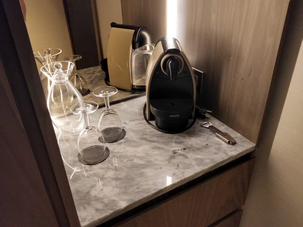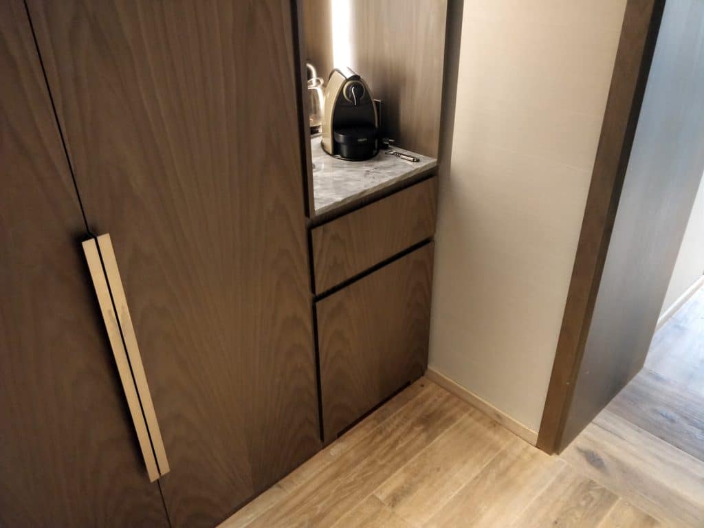 Die Zimmer im Emblem Prag sind (über alle Kategorien hinweg) sehr klein, was für ein Luxushotel doch eher ungewöhnlich ist – darauf sollte man bei der Buchung achten. Die Standardzimmer haben allerdings immerhin einen kleinen Eingangsbereich. Hier findet man unter anderem auch eine Kaffeemaschine, die man kostenfrei nutzen kann, sowie die Minibar.