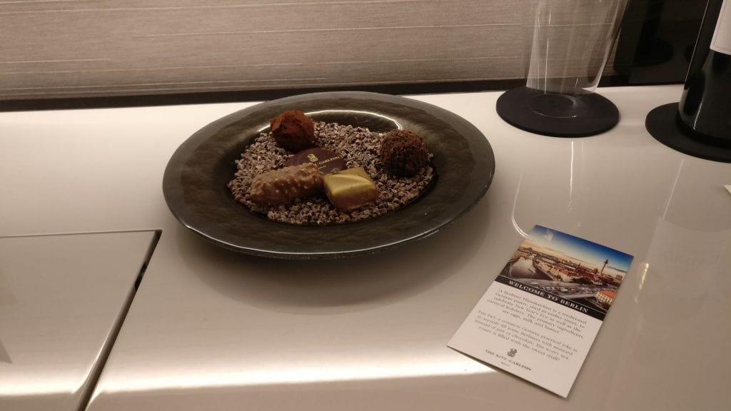 Neben attraktiven Upgrades bietet das Hotel den Gästen auch immer ein besonderes Willkommensgeschenk. In meinem Fall war es eine hochwertige Flasche Champagner mit Obst. Nett fand ich auch den lokalen Touch, denn als kleines Geschenk in jedem Zimmer findet man auch Berliner Gummimäuse.