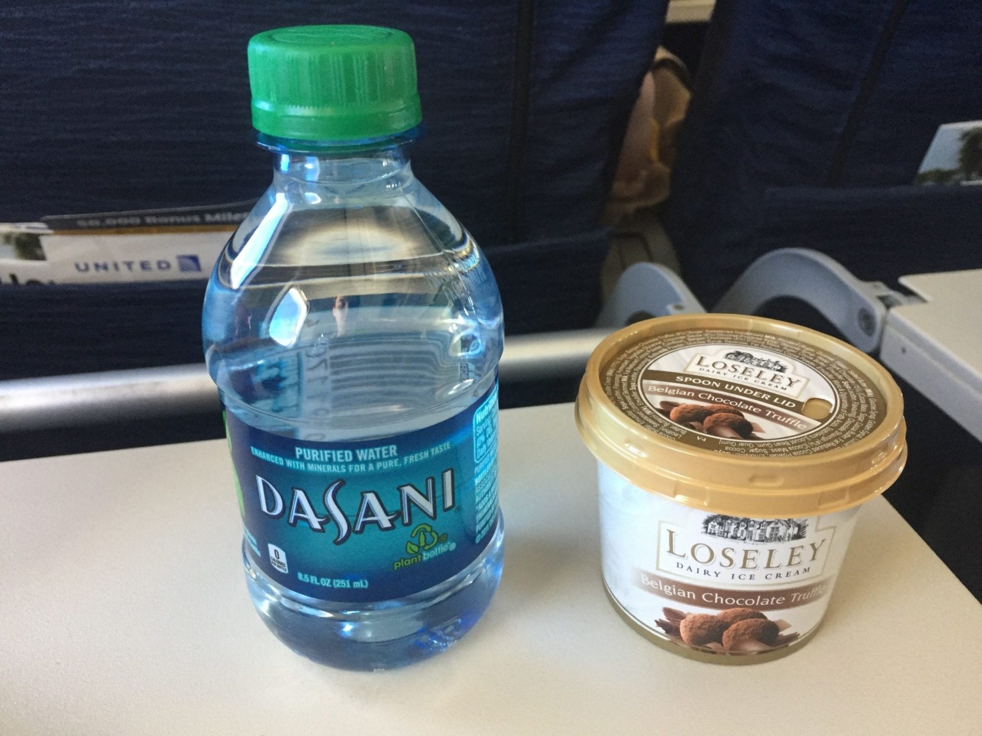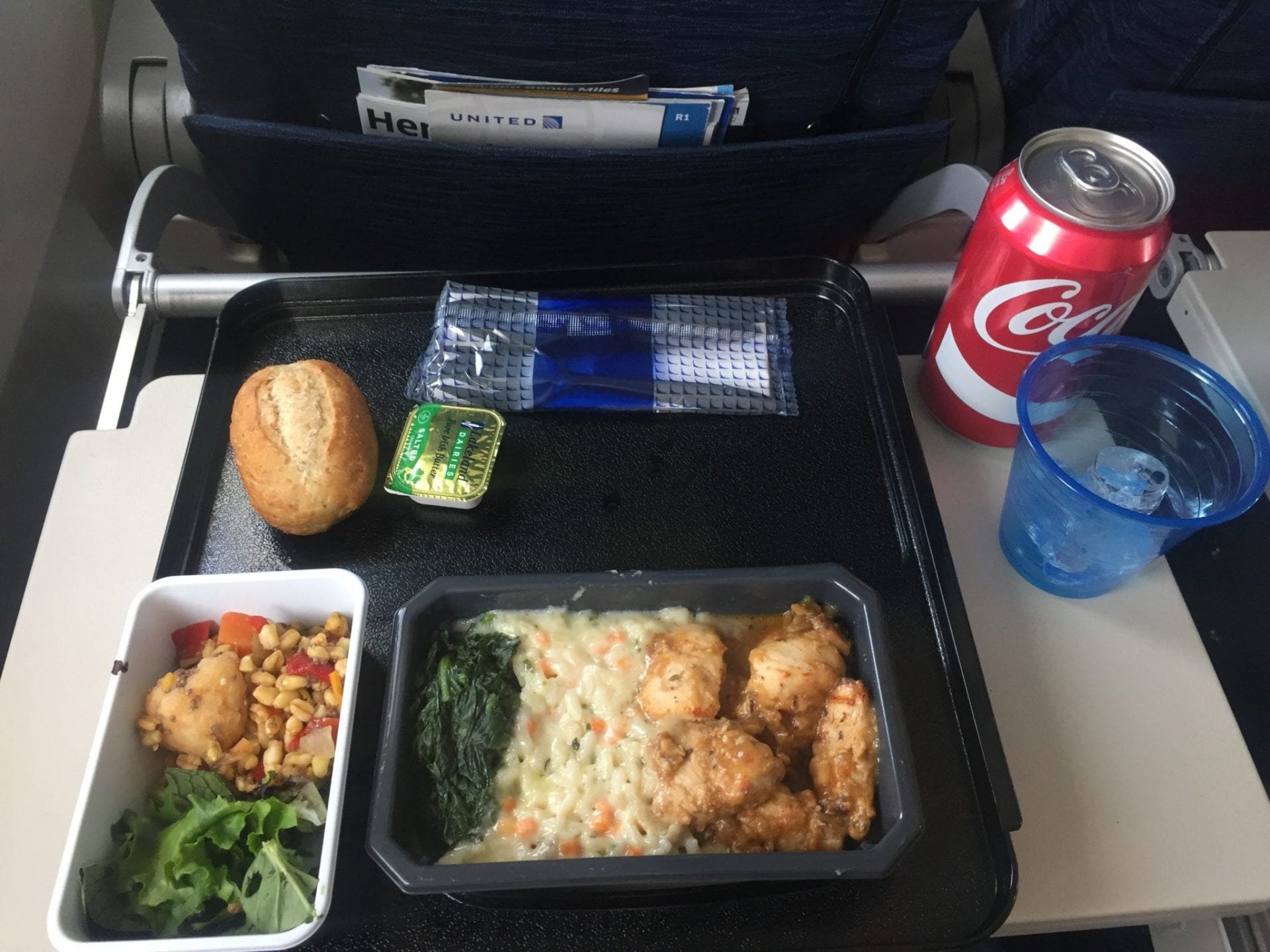 In der United Economy Class auf der Langstrecke werden Getränke grundsätzlich kostenfrei angeboten. Auch alkoholische Getränke, wie Bier und Wein können während den Mahlzeiten kostenlos bestellt werden, lediglich Spirituosen müssen bezahlt werden. Auf Flügen in die USA werden zwei Mahlzeiten serviert. Neben einer größeren Mahlzeit, die je nach Abflugzeit entweder aus einem Mittag- oder Abendessen besteht, wird vor der Landung noch ein Snack gereicht. Während des Fluges stehen außerdem Snacks zur Verfügung und Getränke können ebenfalls bestellt werden. Geschmacklich war das Essen eher unterdurchschnittlich. Dabei wurde die typischen Auswahl zwischen ‘Chicken or Pasta’ angeboten. Das Essen ist genießbar und erfüllt in jedem Fall den Zweck.