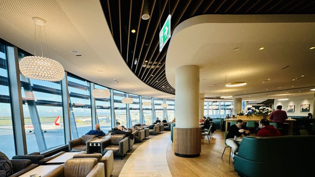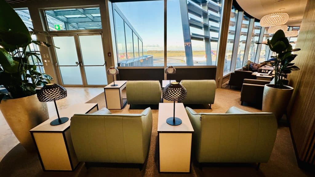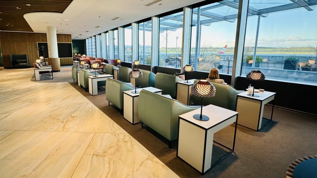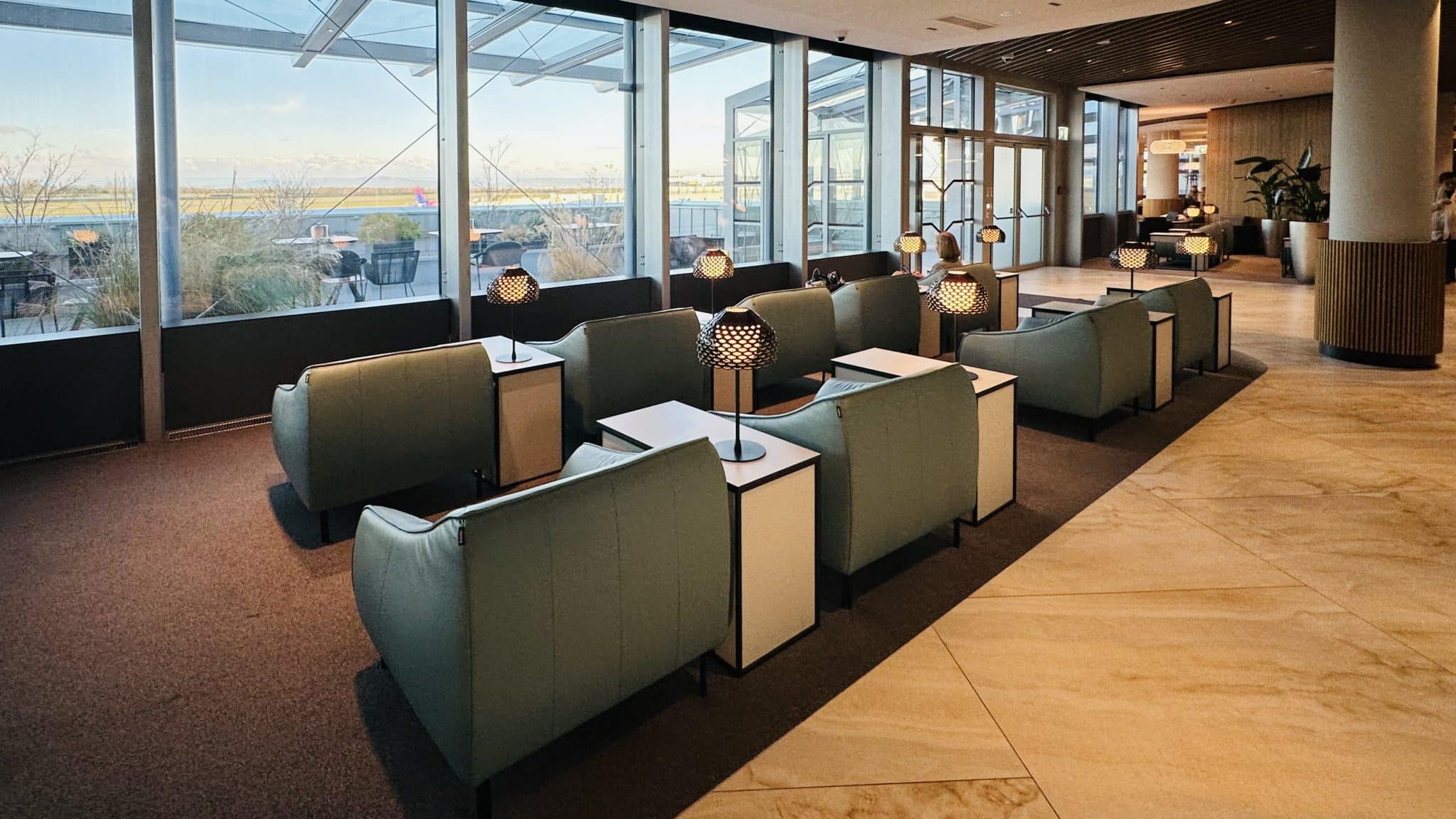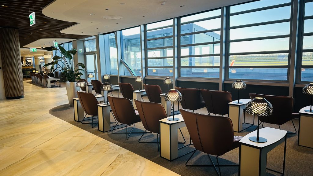 Entlang der gesamten Fensterfront der Lounge stehen verschiedene Sitzmöbel zur Verfügung. Generell bietet die Lounge eine beeindruckende Vielfalt an Sitzgelegenheiten, die sich über mehrere Bereiche verteilen.