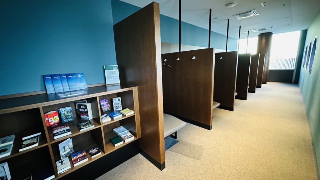 Der Beschreibung der Lounge zufolge gibt es auch Duschen mit Handtüchern und einen Andachtsraum. Für bis zu 40 Personen kann ein Konferenz- und Eventbereich gemietet werden.