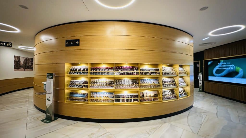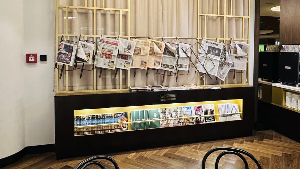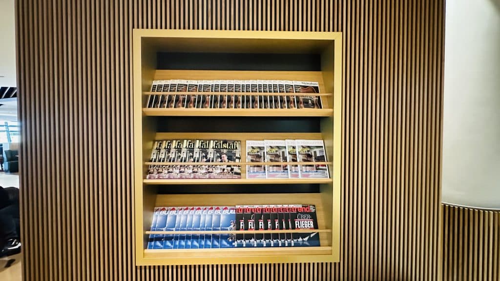 An verschiedenen Stellen in der Lounge ist eine Auswahl an Zeitschriften und Magazinen ausgestellt.
