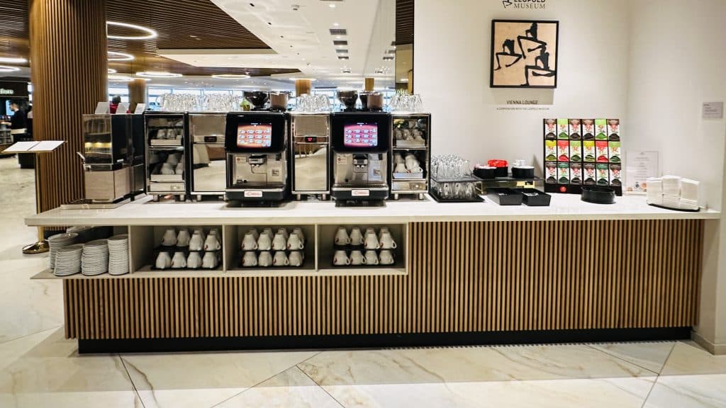 Im vorderen Bereich der Lounge stehen gleich zwei Kaffeevollautomaten zur Verfügung, die zum schnellen Kaffeegenuss einladen.