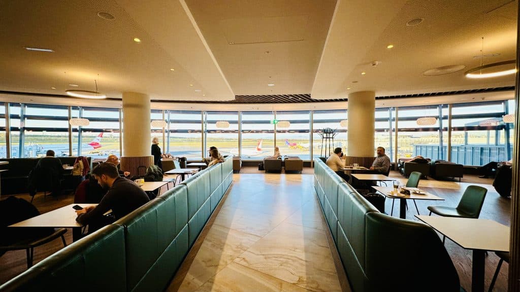 Besonders positiv fiel mir sofort die durchgehende Fensterfront auf, die sich über die gesamte Länge der Lounge erstreckt und für eine helle, offene Atmosphäre sorgt. Von hier aus bietet sich ein fantastischer Blick auf das geschäftige Treiben auf dem Rollfeld sowie eine der Start- und Landebahnen des Flughafens.