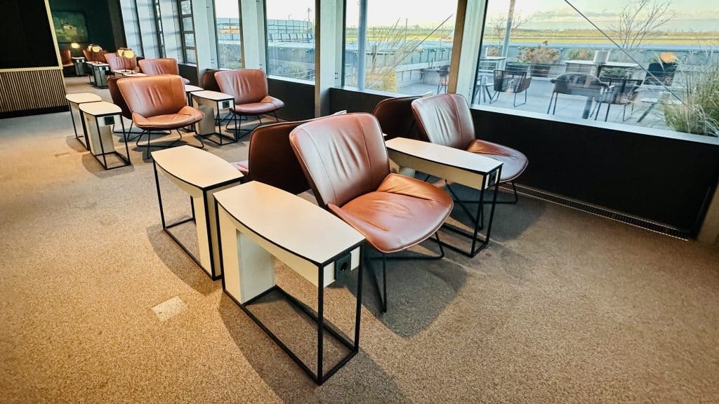Rechts an der Fensterfront stehen bequeme Einzelsessel bereit, von denen aus man einen direkten Blick auf das Rollfeld genießen kann.