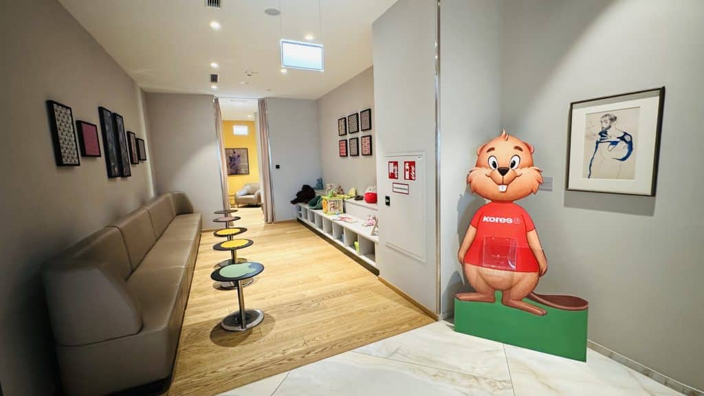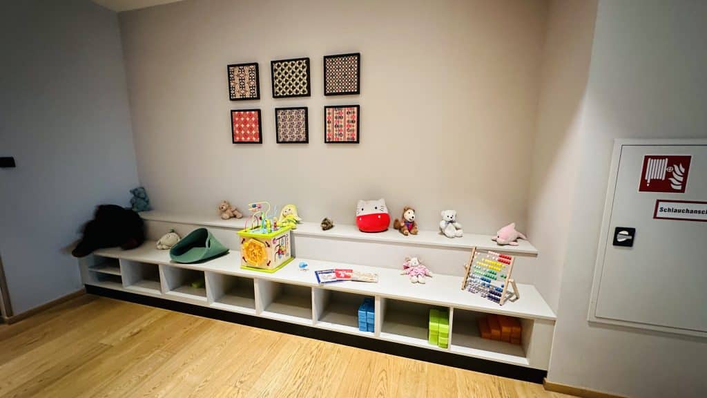 Für die kleinen Gäste gibt es ein Spielbereich mit Familien-WC und Wickeltisch im linken hinteren Bereich der Lounge.