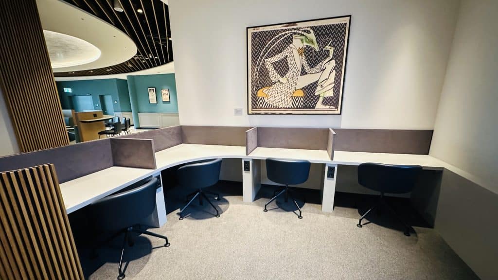 Geht man rechts den Gang weiter entlang, kommt man zu den Toiletten und dem großen Arbeitsbereich, der sich auf dieser Seite der Lounge erstreckt. Er besteht aus verschiedenen Bereichen, die auch farblich unterschiedlich gestaltet sind.