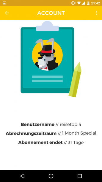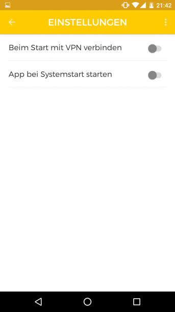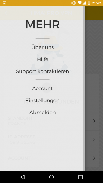 Im Menü erhaltet Ihr die Möglichkeit, den Support zu kontaktieren oder Euch die Hilfe-Sektion anzuschauen. Unter “Account” findet Ihr alles wissenswerte wie zum Beispiel das Enddatum Eures Accounts. Unter Einstellungen habt Ihr die Möglichkeit, die Funktion zu wählen, dass der HMA VPN Tunnel beim Start des Gerätes gestartet wird und dass dieser sich sofort mit dem letzten gewählten Server verbindet.