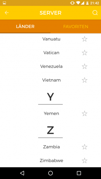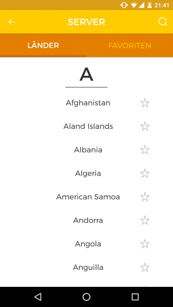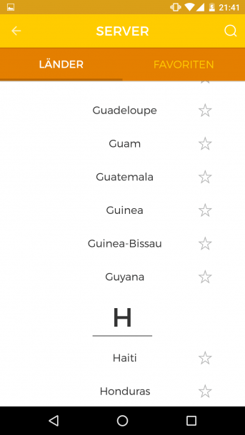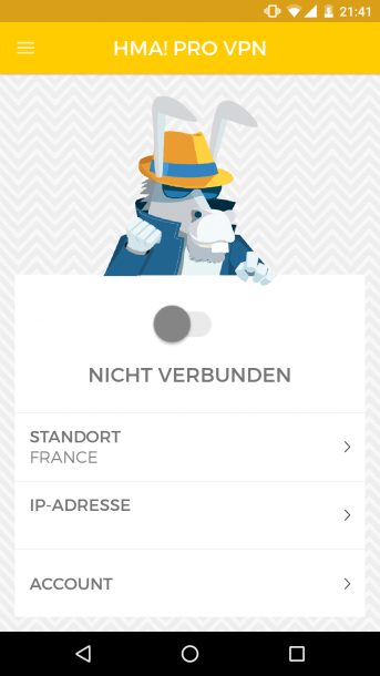 Die Software für mobile Endgeräte sieht eigentlich genauso wie die für den PC aus (Screenshots von der Android Version). Wird diese gestartet, so könnt Ihr Euch über das Standort Menü einen Server Standort Eurer Wahl aussuchen. Wenn Ihr auf den Stern neben dem Land klickt, wird dieser in Eurer Favoriten Liste gespeichert. Bei erfolgreicher Verbindung zeigt auch hier der HMA Esel wieder die Länderflagge des gewählten Standorts.