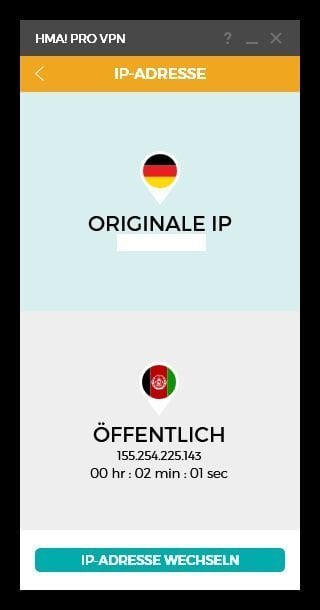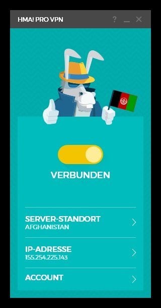 Mit einem Klick auf “Server-Standort” kommt Ihr zu einer Liste mit allen verfügbaren Standorten. Wenn Ihr einen Standort ausgewählt habt, müsst Ihr noch noch auf dem Schieberegler über “nicht verbunden” streichen und eine Verbindung wird aufgebaut. Dass die Verbindung erfolgreich war seht Ihr daran, dass die Farbe sich geändert hat und der Esel die Landesflagge des gewählten Standords in der Hand hält. Ebenfalls ist auch die neue IP Adresse sichtbar. Diese lässt sich über das Menü auch wechseln, falls es Probleme gibt. Zusätzlich werden Euch nach erfolgreicher Verbindung auch noch zwei Fenster über der Taskleiste angezeigt.