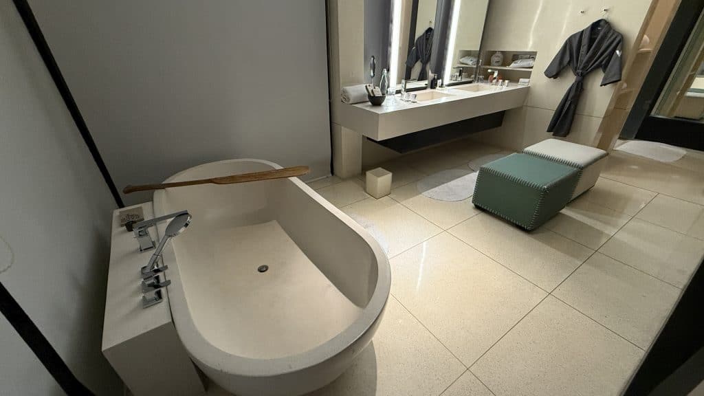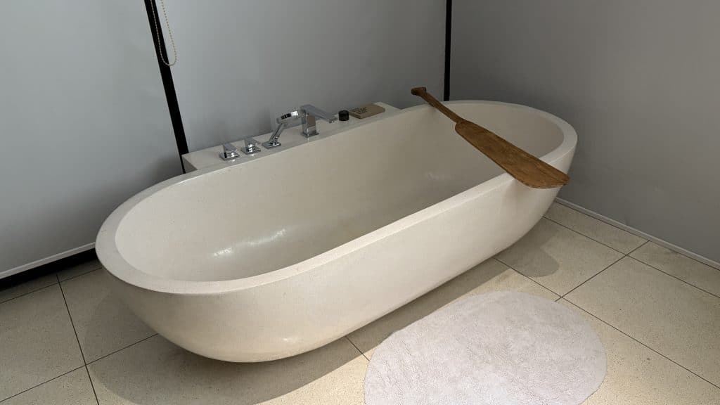 Zum Fenster hin ausgerichtet findet man auch noch eine frei stehende Badewanne, die eine kreative Ablagemöglichkeit in Form eines Paddels bietet.