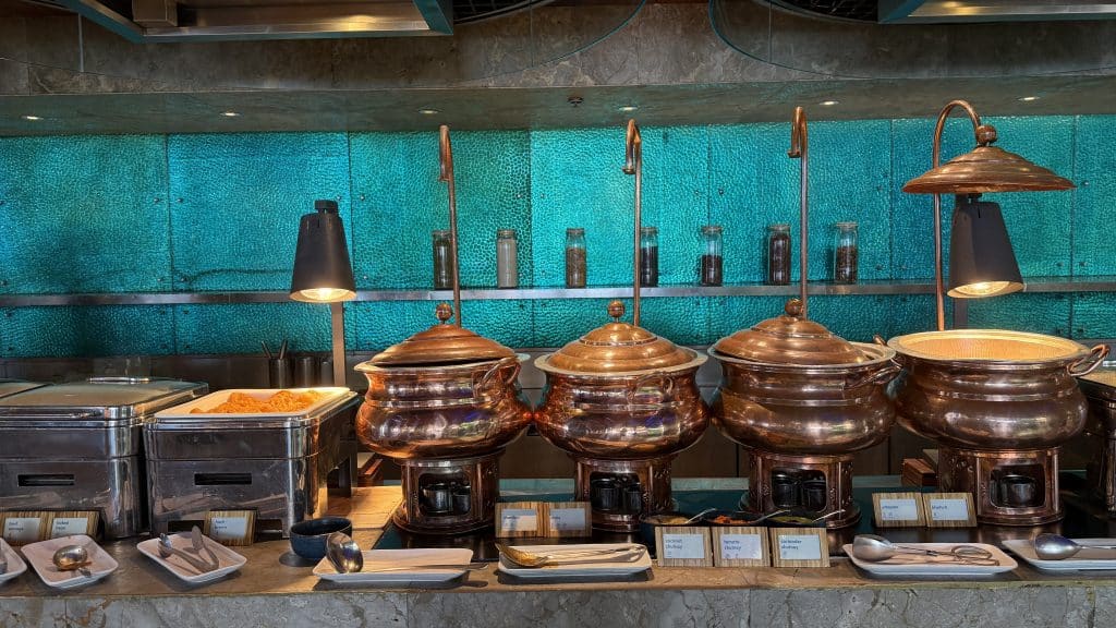Natürlich gibt es darüber hinaus auch ein breites Angebot an warmen Speisen, wobei neben westlichen Speisen auch zahlreiche andere Optionen geboten werden – etwa verschiedene indische Gerichte.